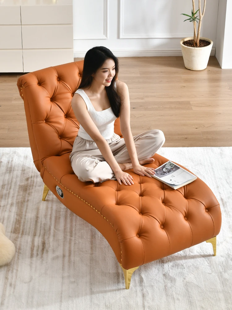 American Style Luxurious Chaise Lounge Sofa - Single Genuine Leather Recliner for Home and Balcony, Designer Lazy Chair, Perfect for Sitting or Lying Down.