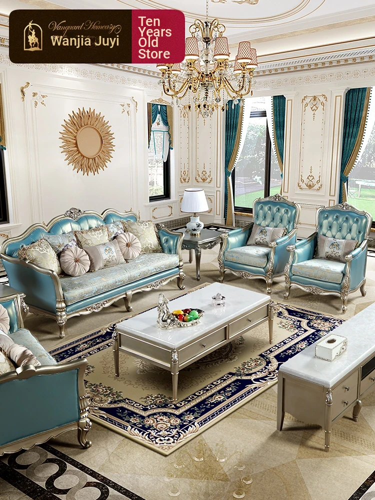 Elegant European Style Sofa Set - Luxury Genuine Leather & Fabric Living Room Combination, French-inspired Three-Seater with Solid Wood Furniture for a Regal Home Décor.