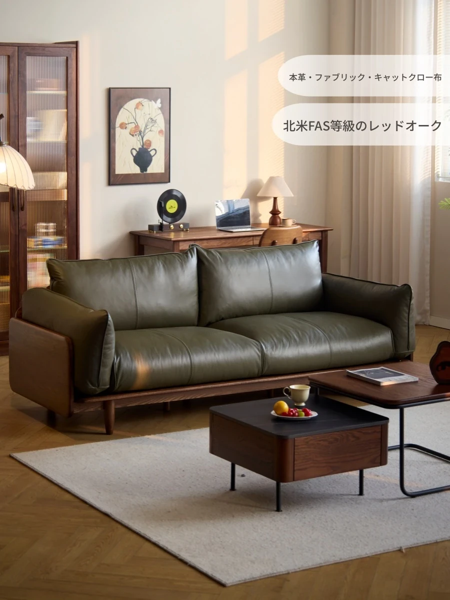 新中式オーク無垢材ソファ|本革使用|北欧スタイル小型リビング向け家具|天然木の直線デザイン布張りソファで、洗練された空間を演出!