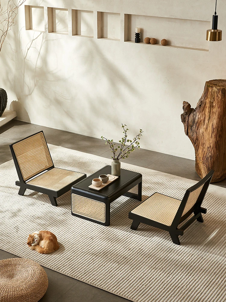 Chandigarh Solid Wood Rattan Tatami Chair and Table Set – Perfect for Balconies and Bay Windows, Ideal for Relaxing with a Cup of Tea. Stylish Single Leisure Chair with Backrest, Perfect for Cozy Spaces.
