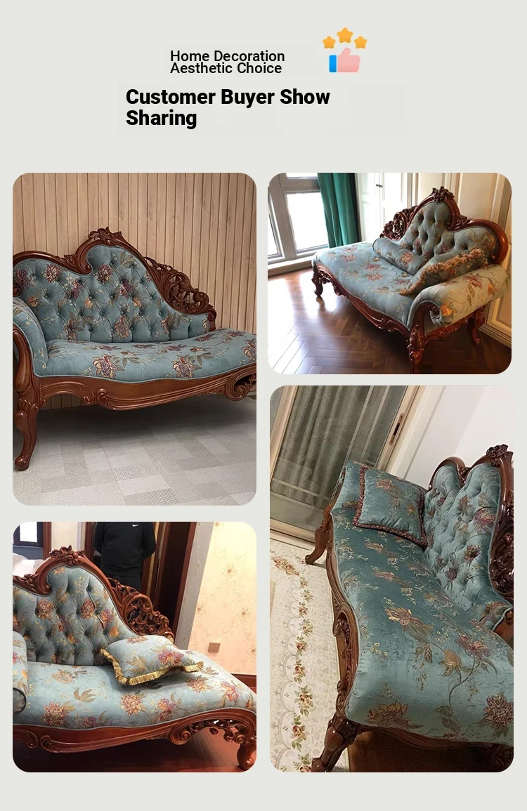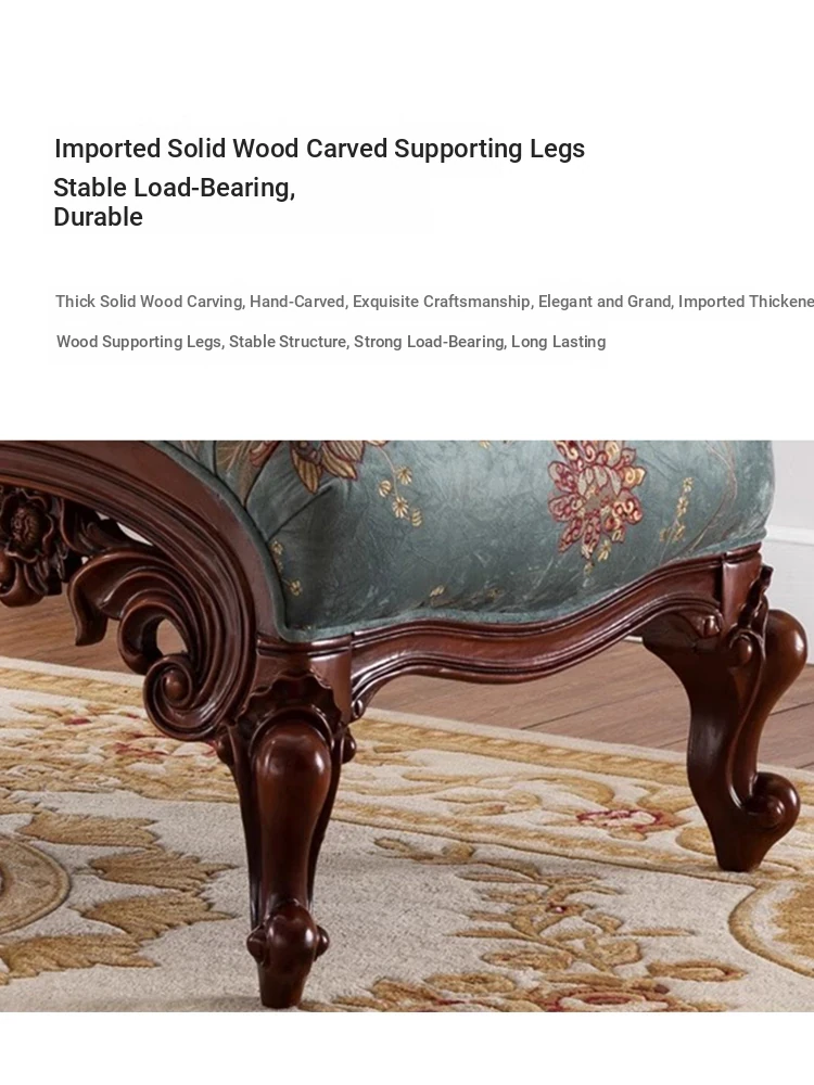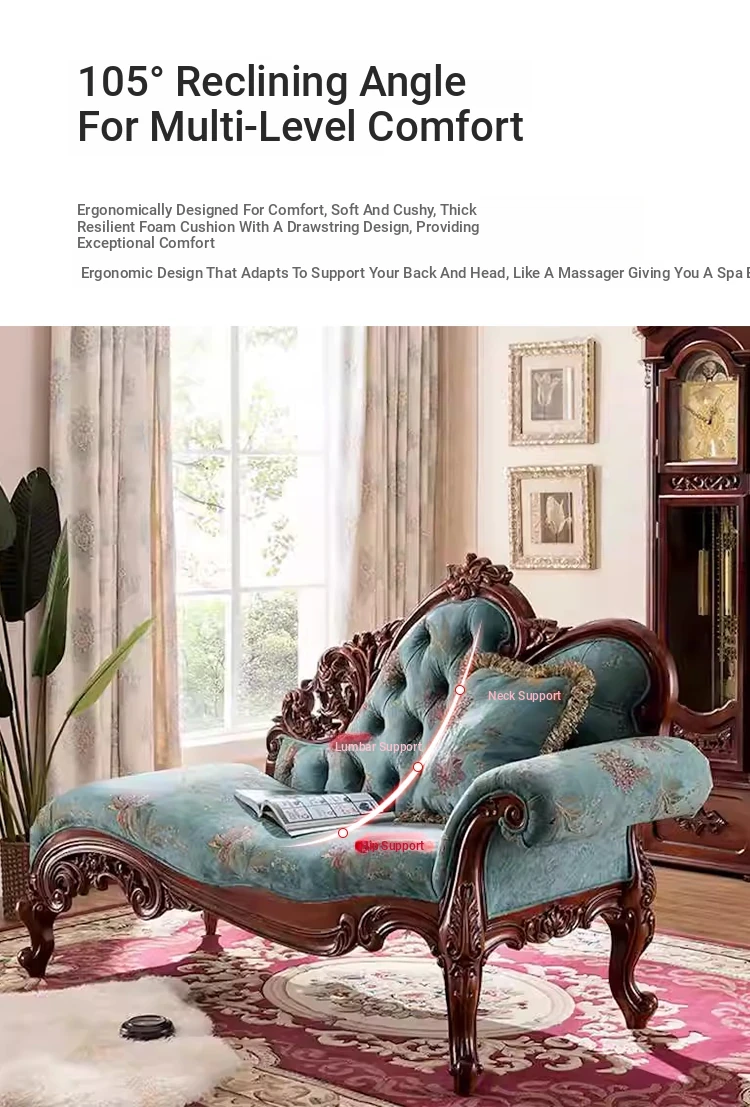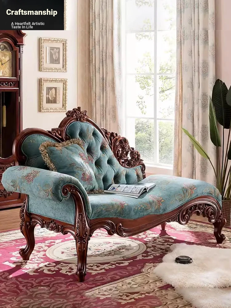 American Style Solid Wood Chaise Lounge - Elegant Fabric Upholstered Daybed for Bedroom, Cozy Sofa Chair for Living Room, Single Seat for Balcony, Perfect for Relaxing and Napping.