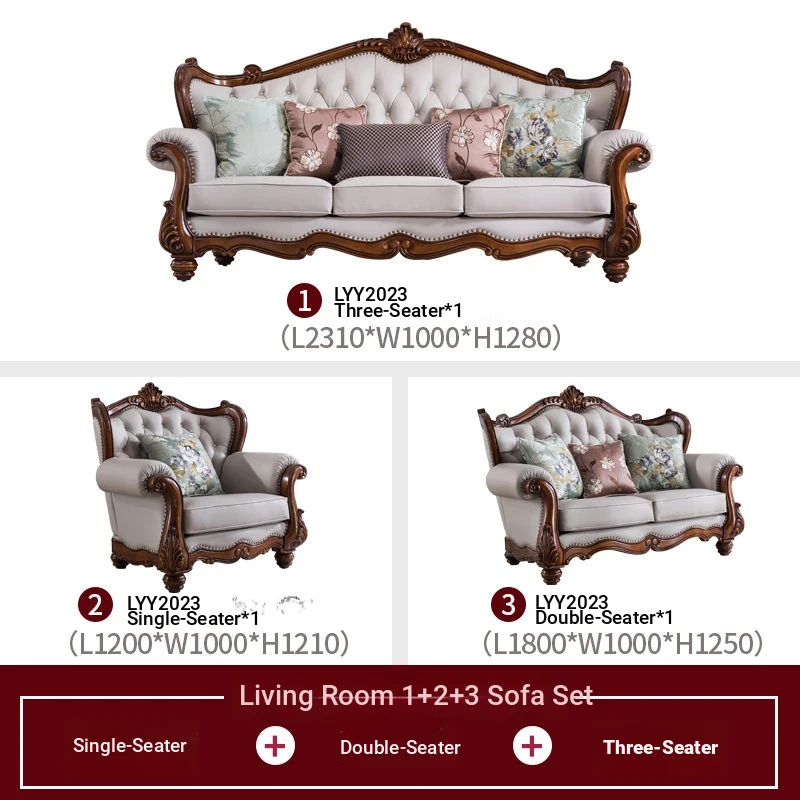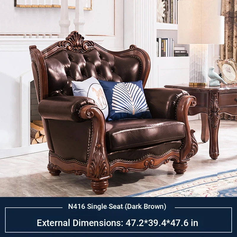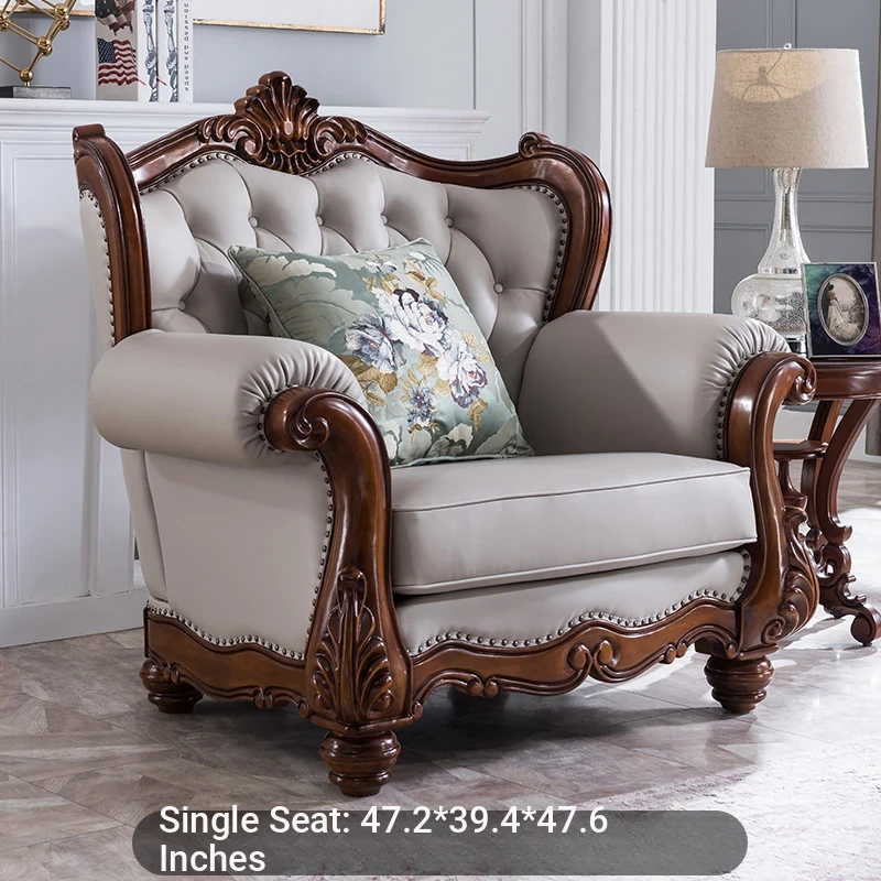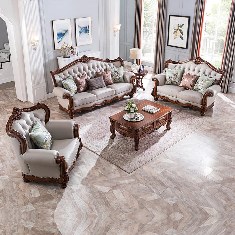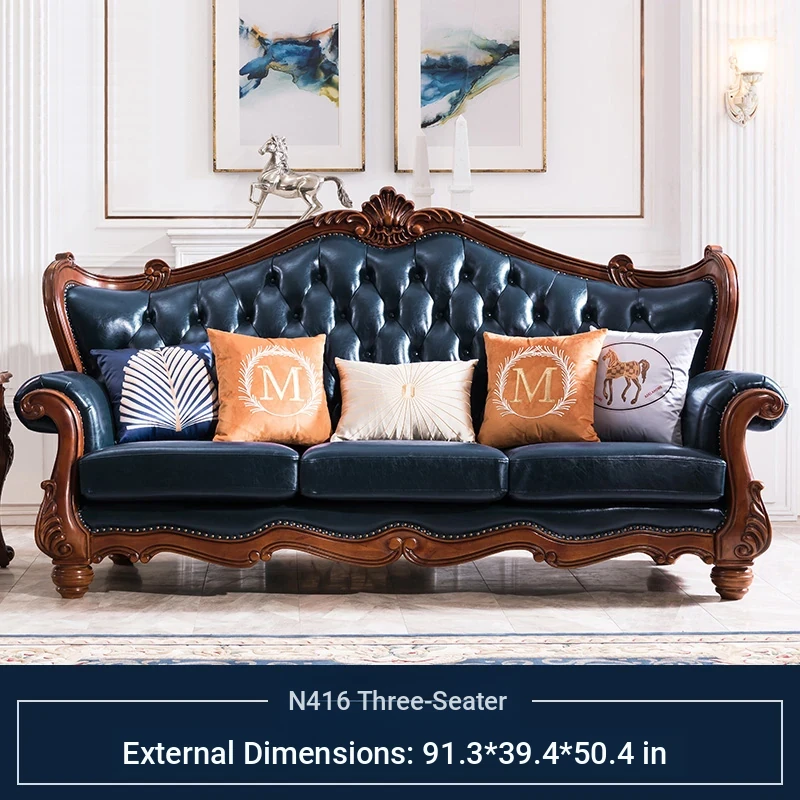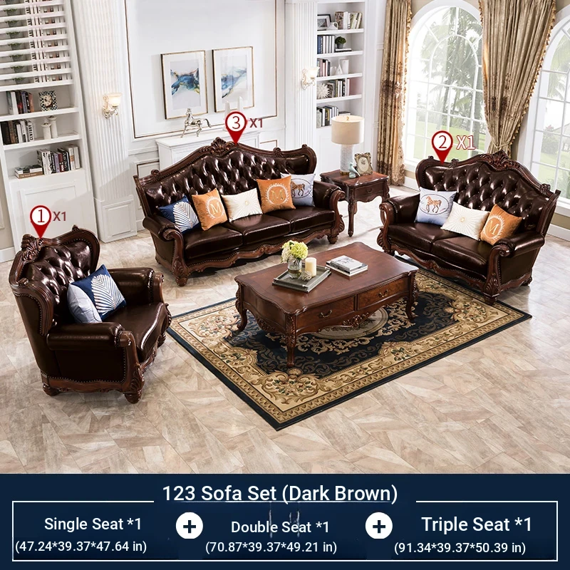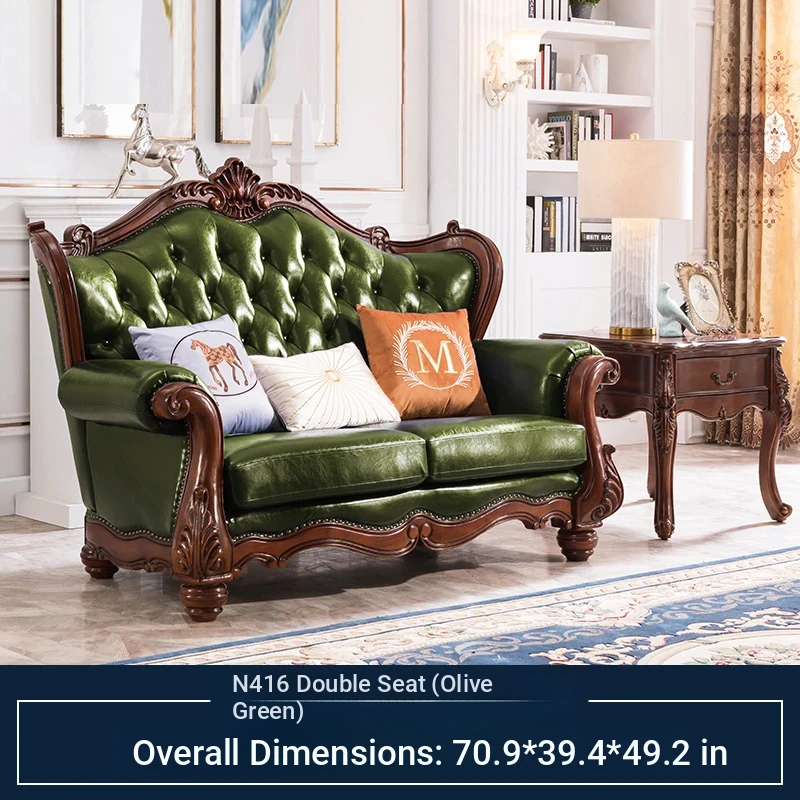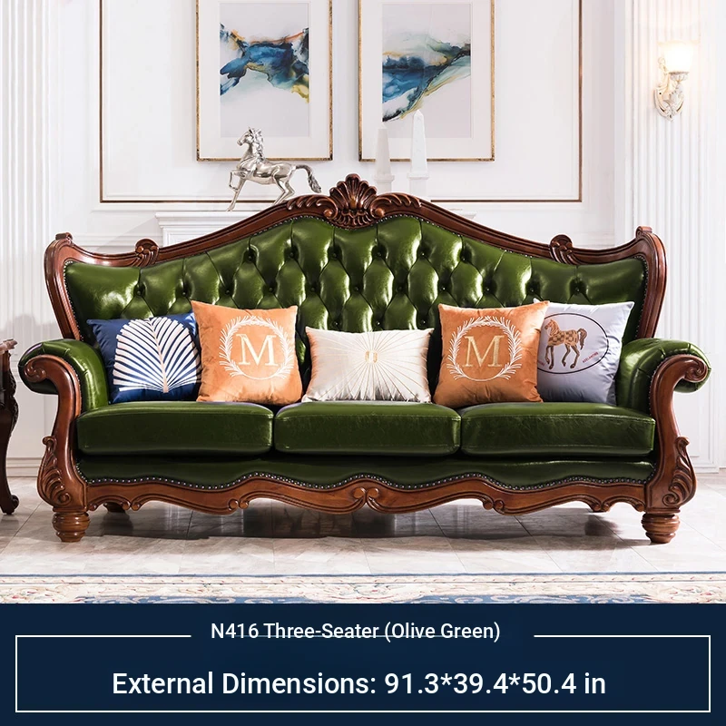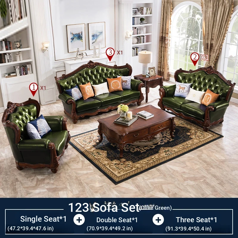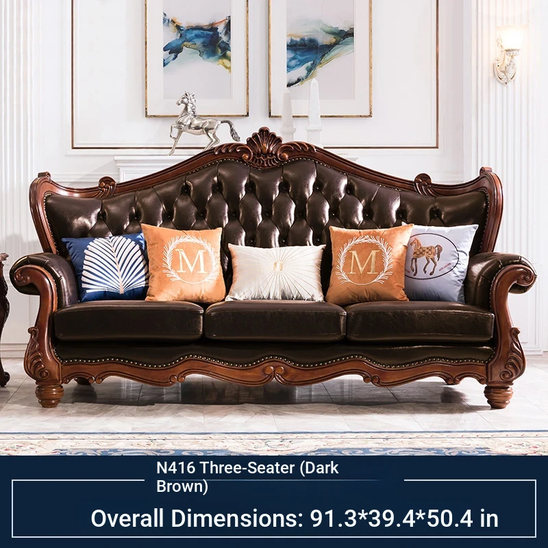 American Style Solid Wood Leather Sofa Set - 3-Seater for Small Spaces, Includes Elegant Coffee Table, Perfect for Villas and Modern Living Rooms with Exquisite Carvings