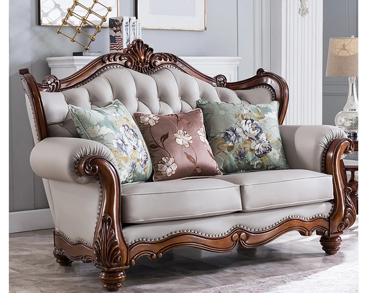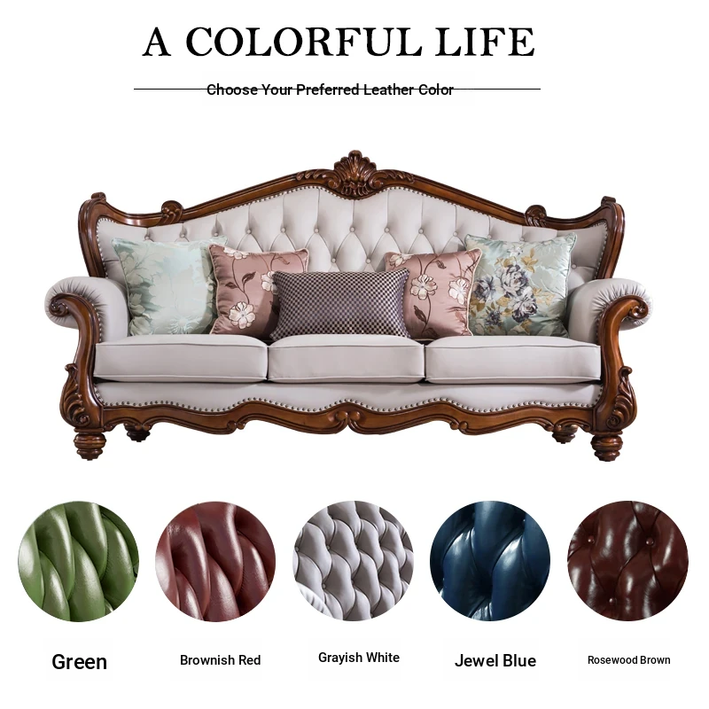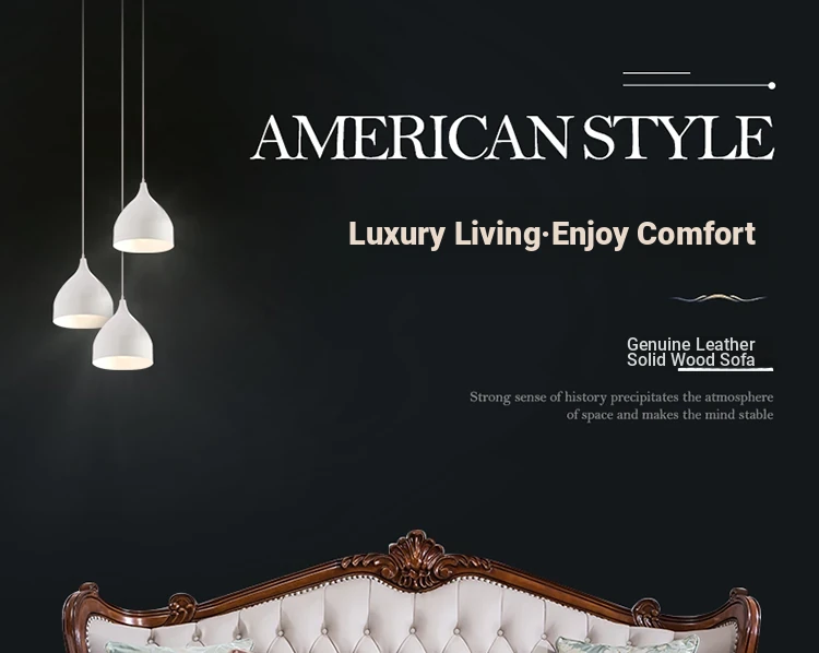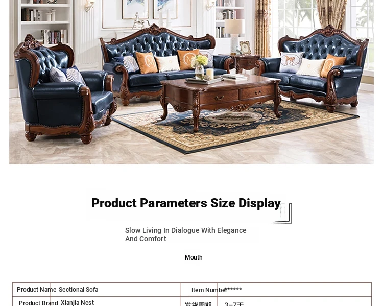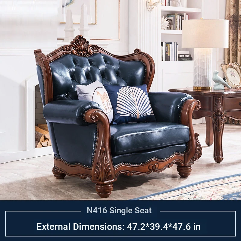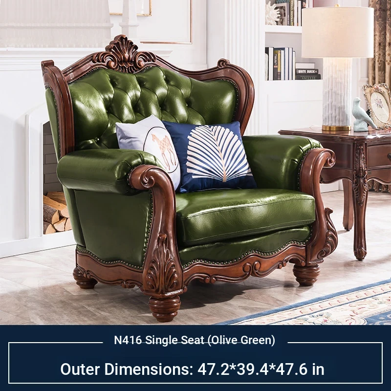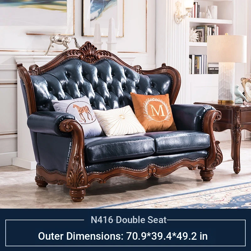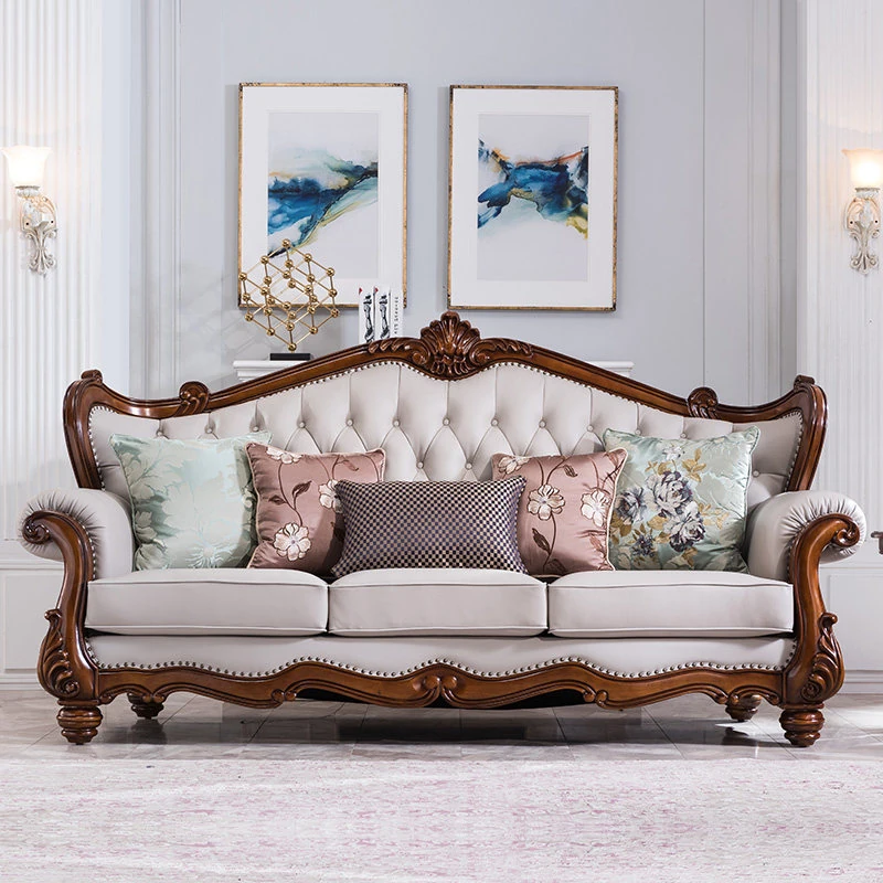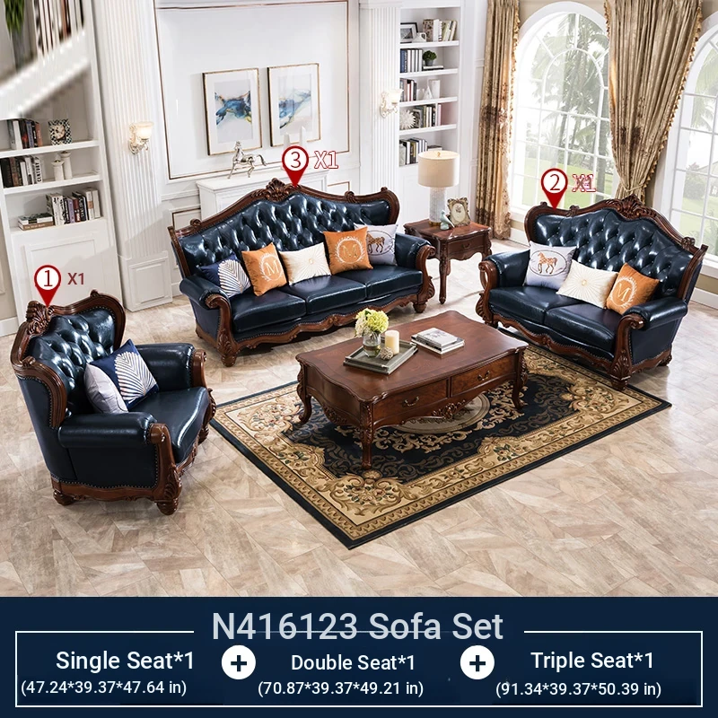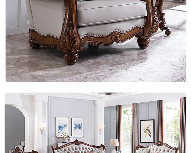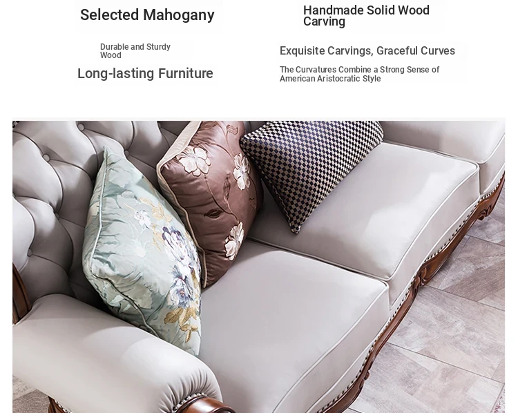 American Style Solid Wood Leather Sofa Set - 3-Seater for Small Spaces, Includes Elegant Coffee Table, Perfect for Villas and Modern Living Rooms with Exquisite Carvings