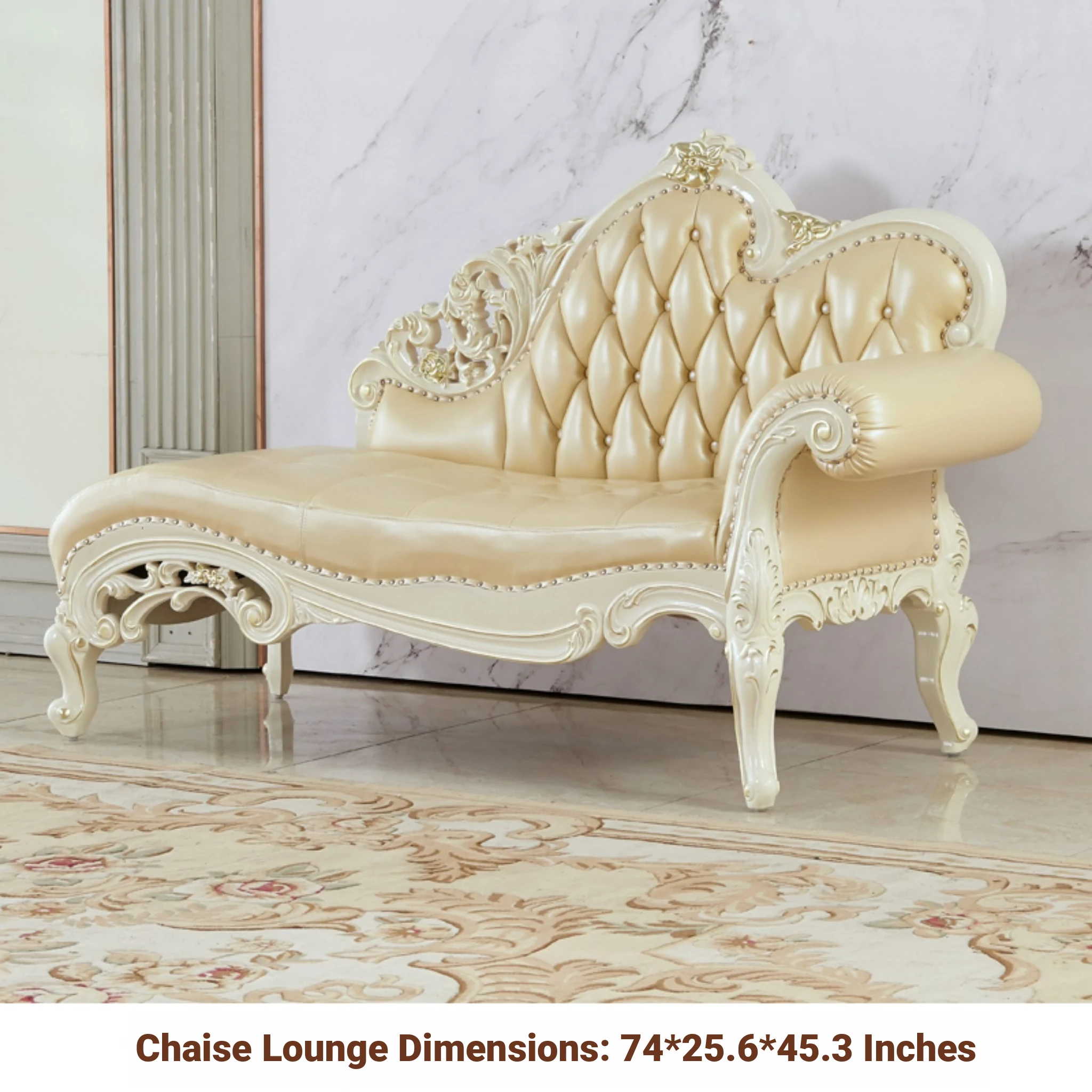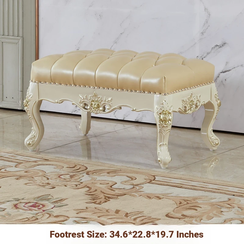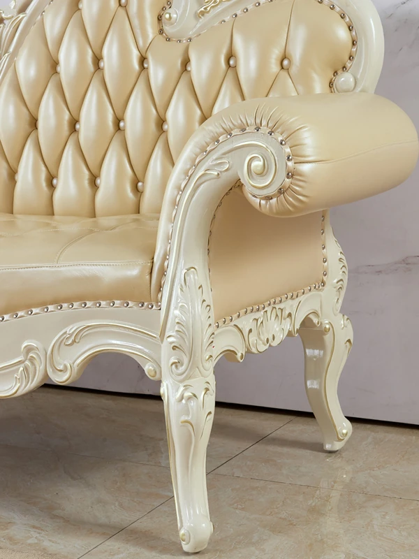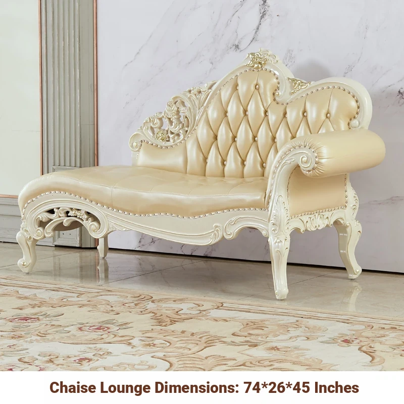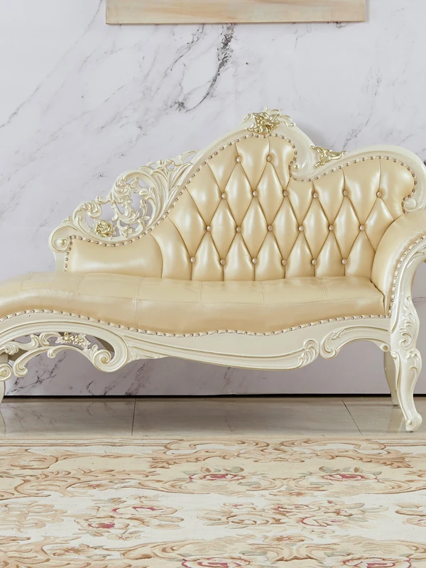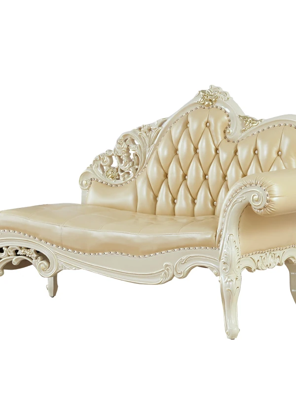 European Style Solid Wood Chaise Lounge - Ivory White Genuine Leather Sofa for Bedroom Relaxation