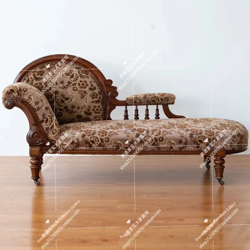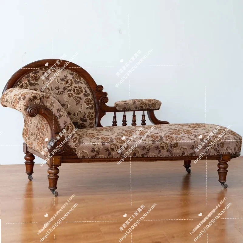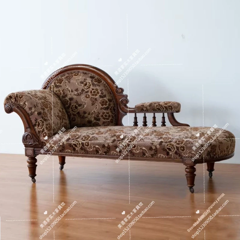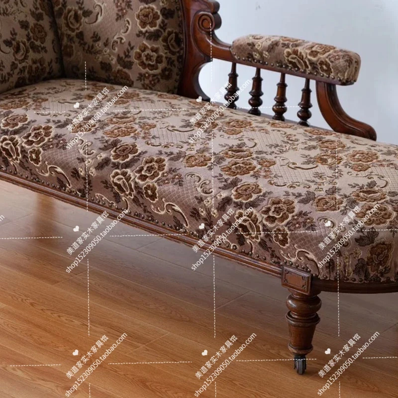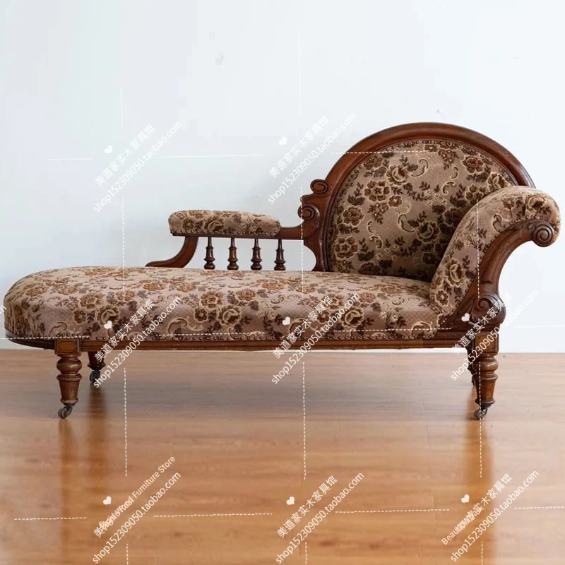 French Vintage Solid Wood Carved Chaise Lounge - Upholstered Antique Villa Balcony Beauty Bed, Perfect for Relaxing in Old Shanghai Style