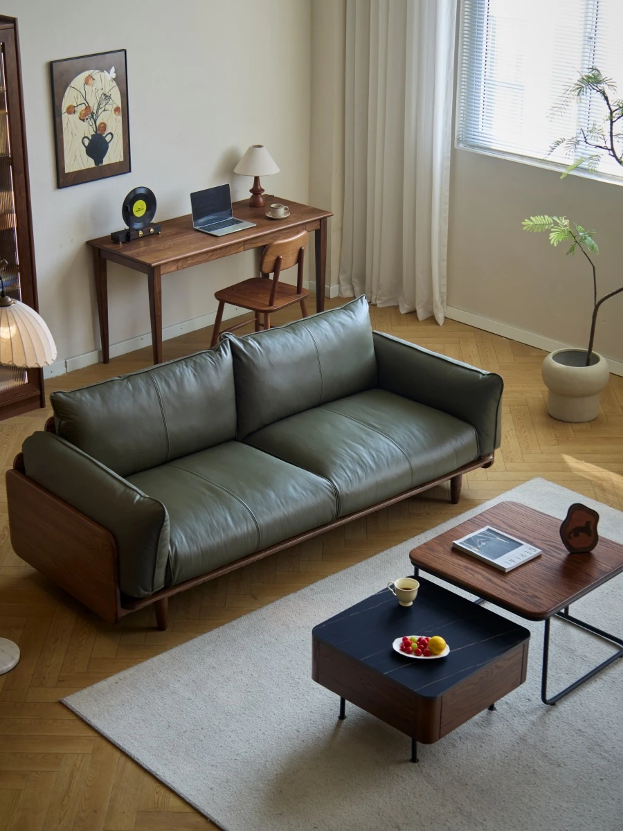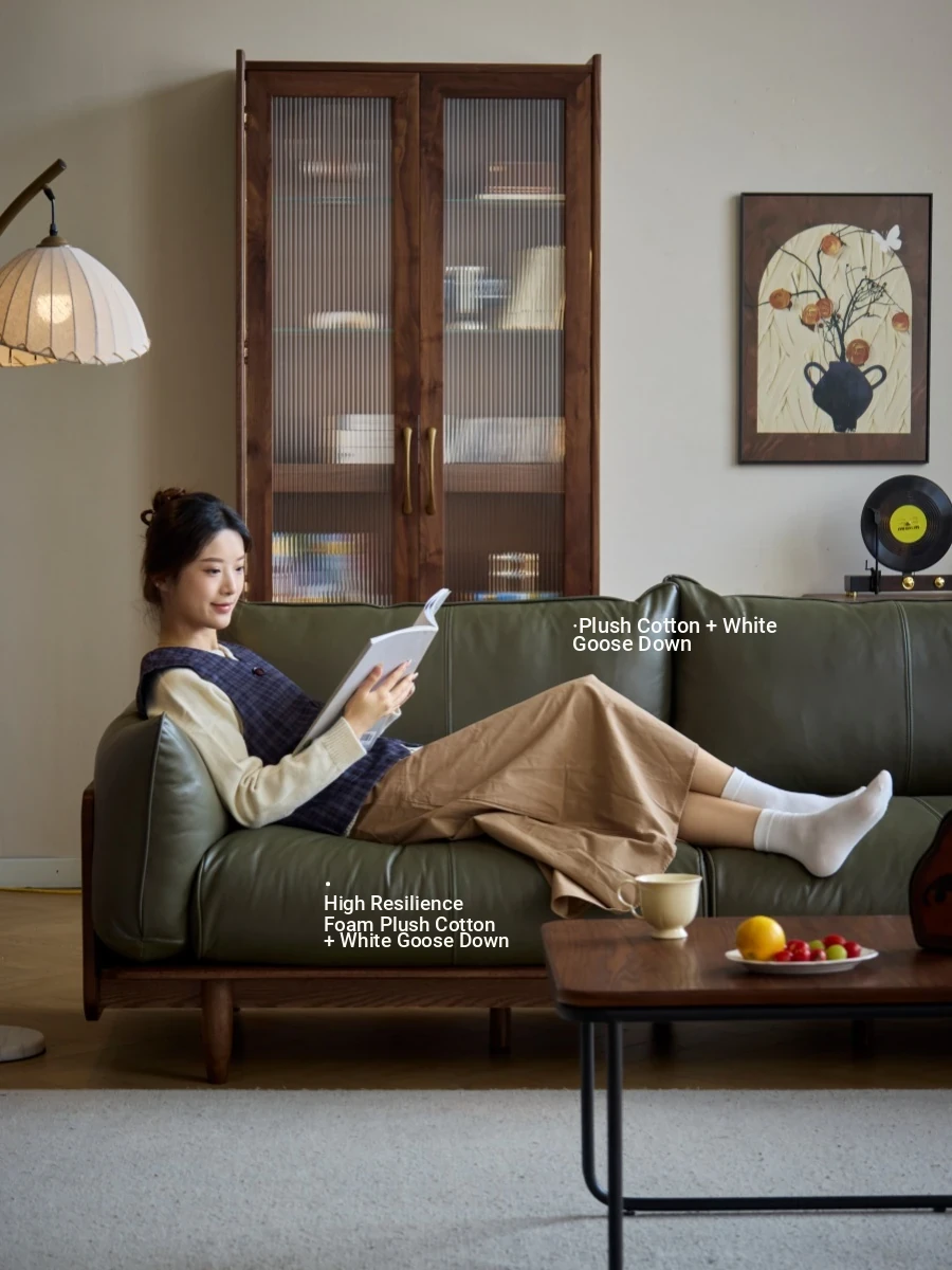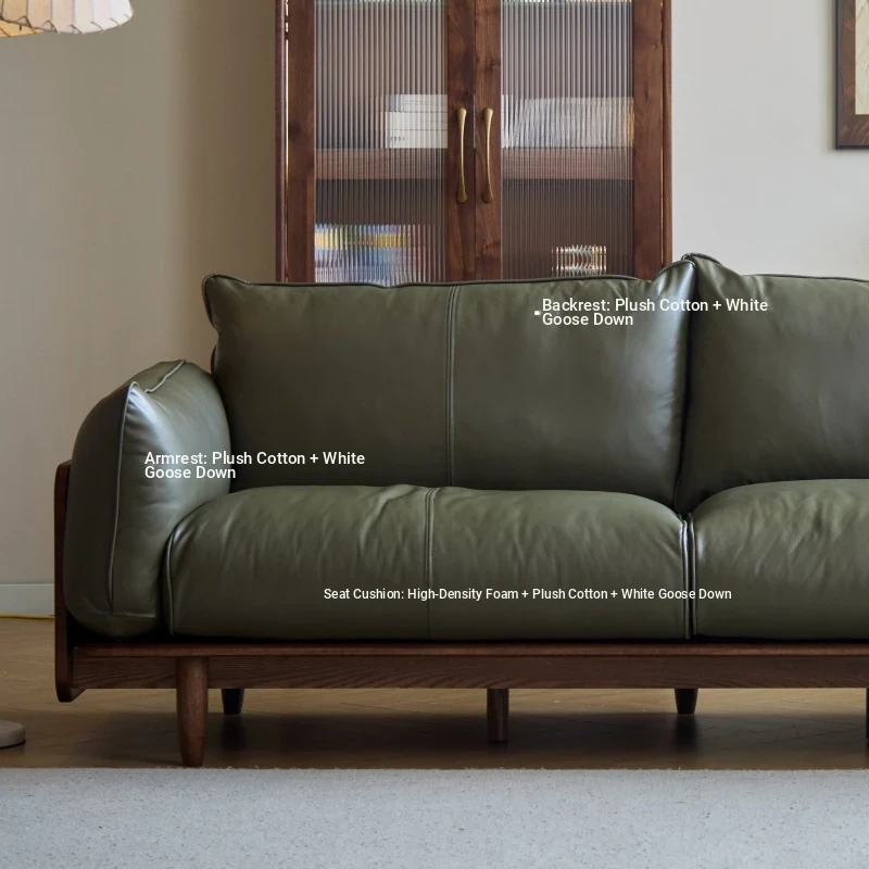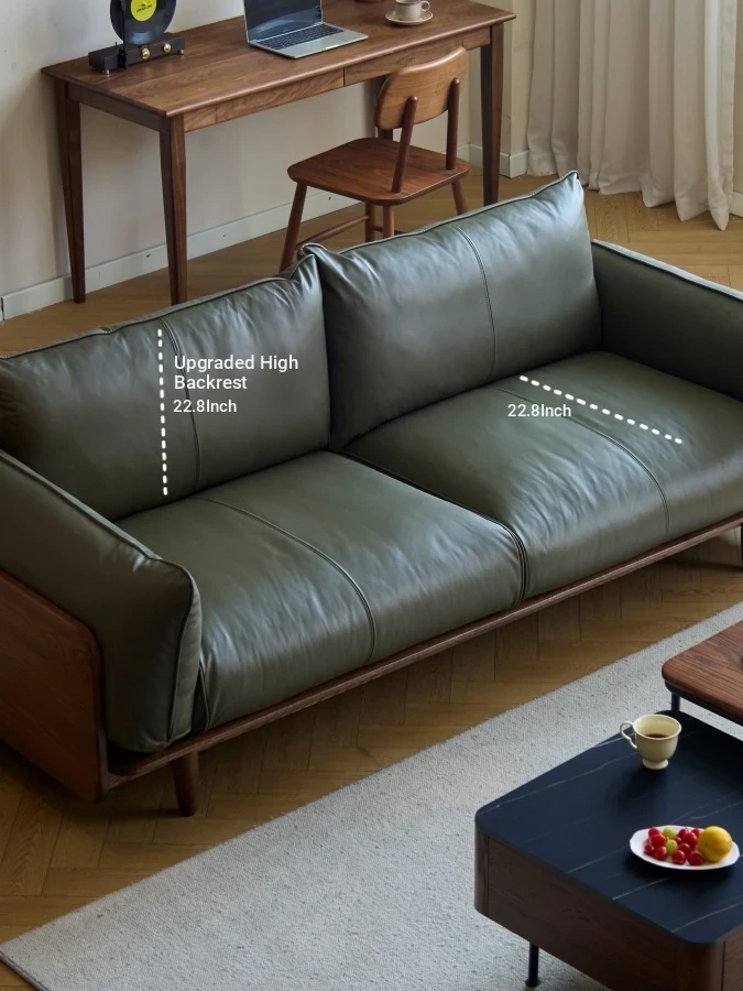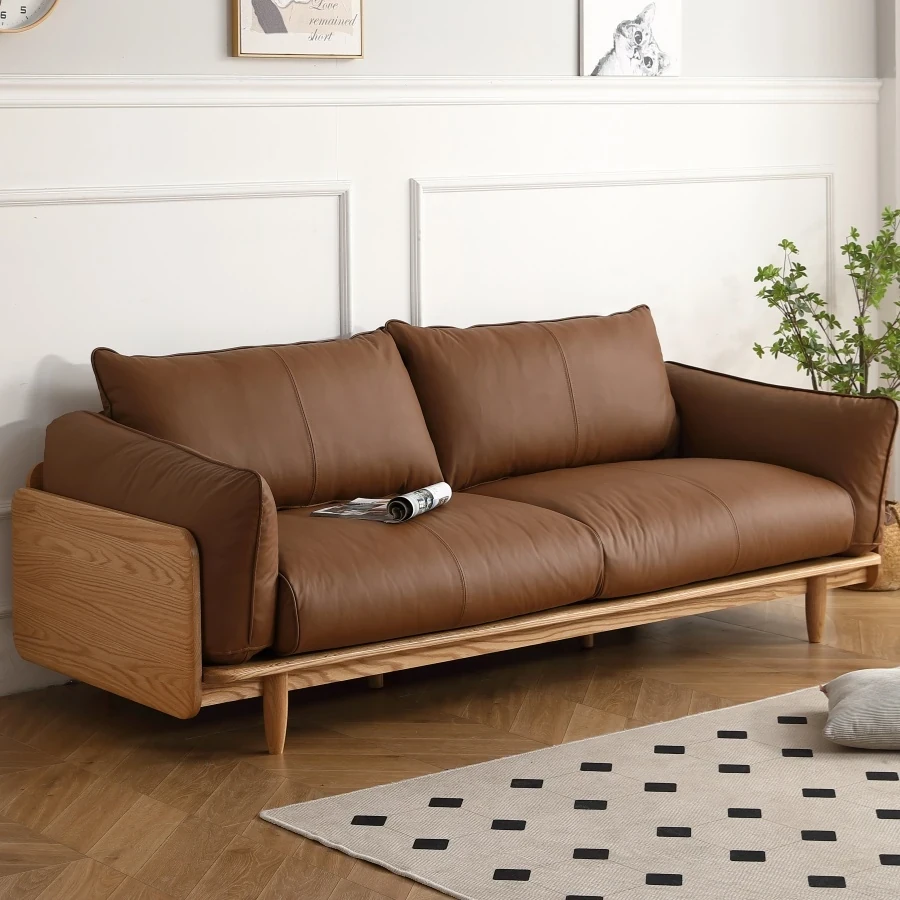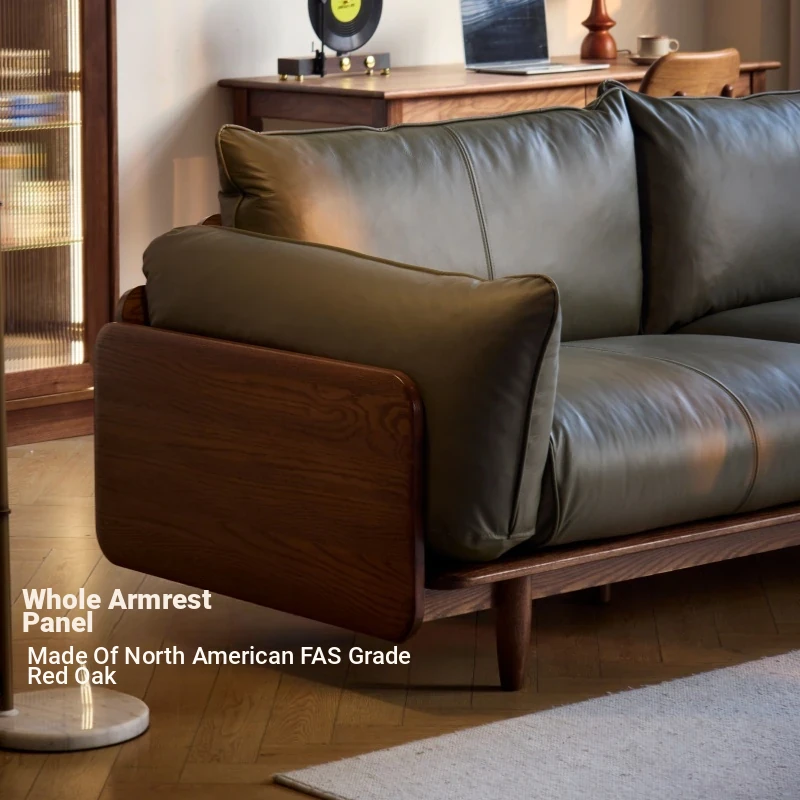 Solid Wood Sofa - Red Oak Real Leather Sofa for Nordic Living Room, Home Use, Original Wood Straight Line Upholstered Sofa with High Backrest - Perfect Blend of Comfort and Style!