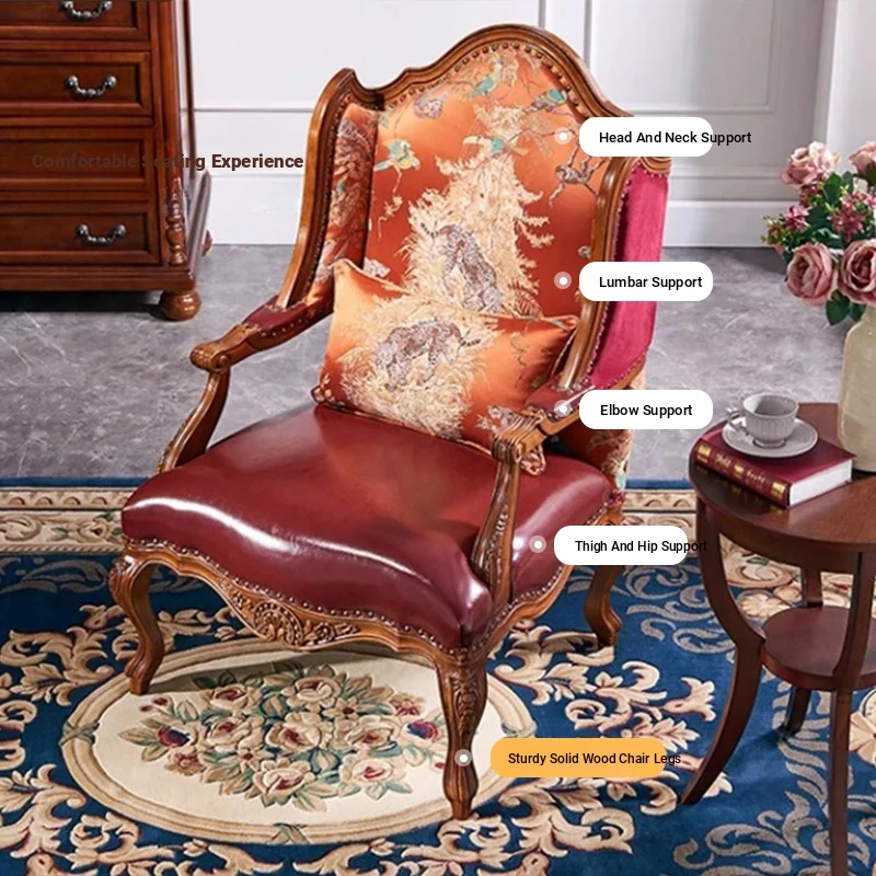 Designer American Luxury Leather Armchair - Elegant European Style Solid Wood Lounge Chair for Living Room, Perfect for Conversations and Relaxation