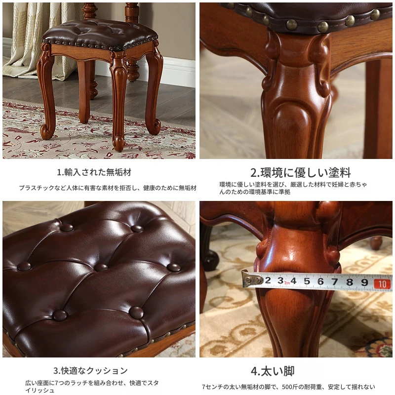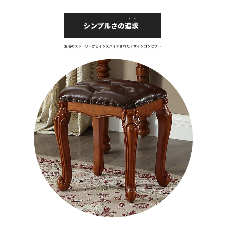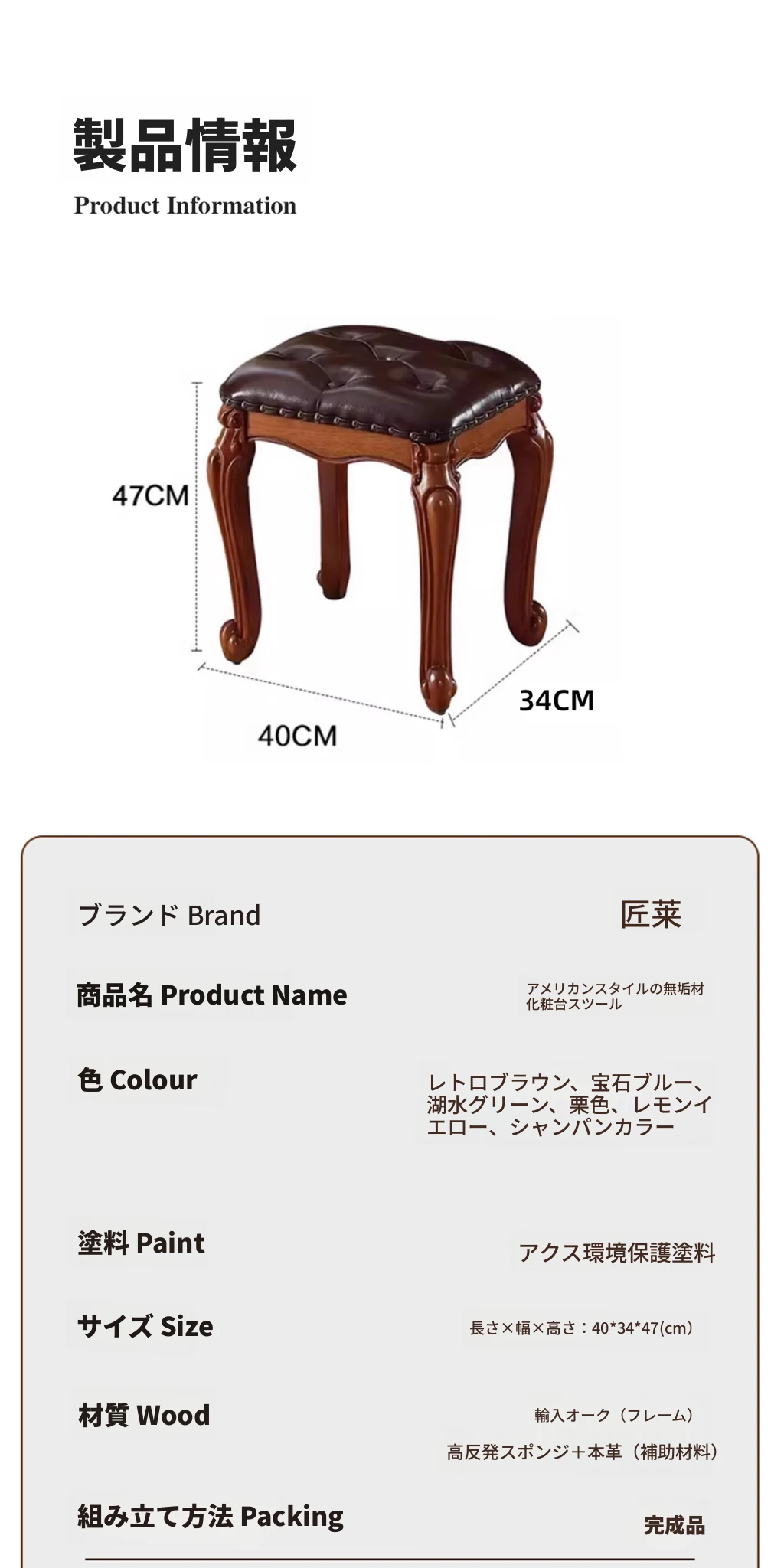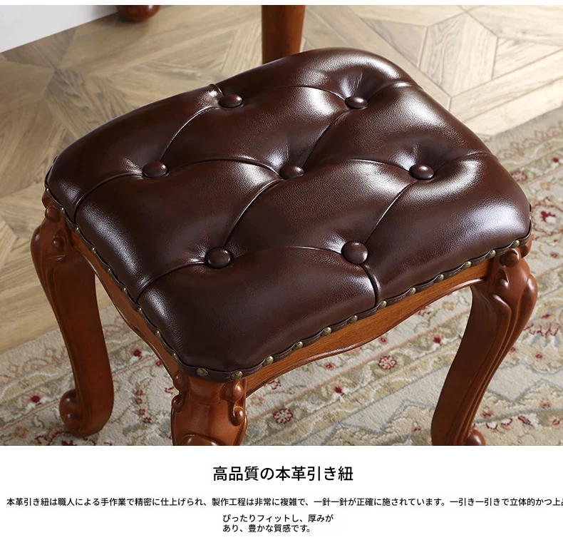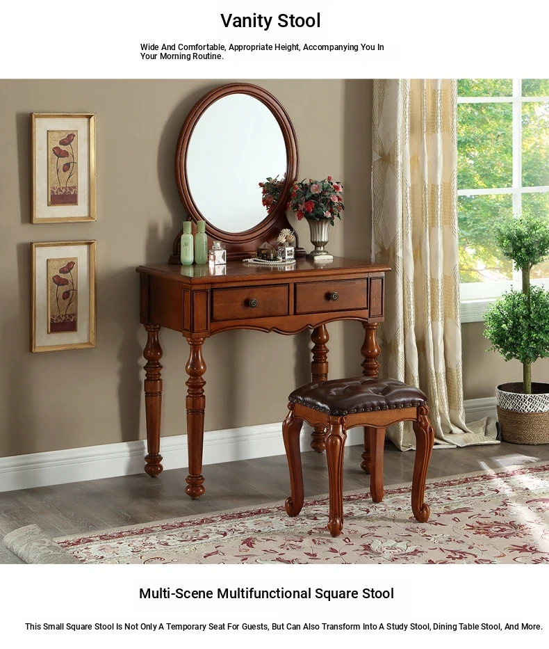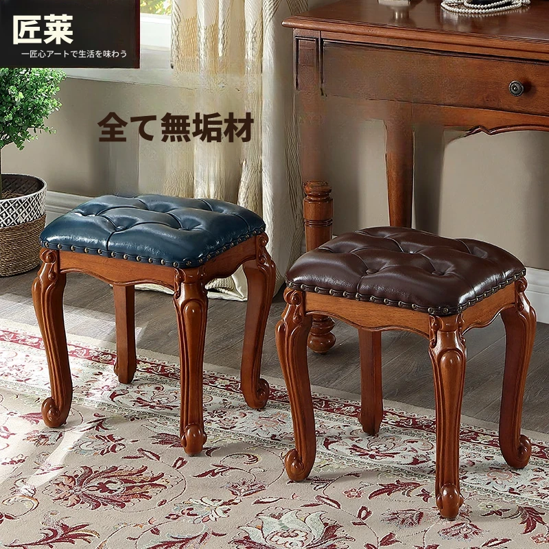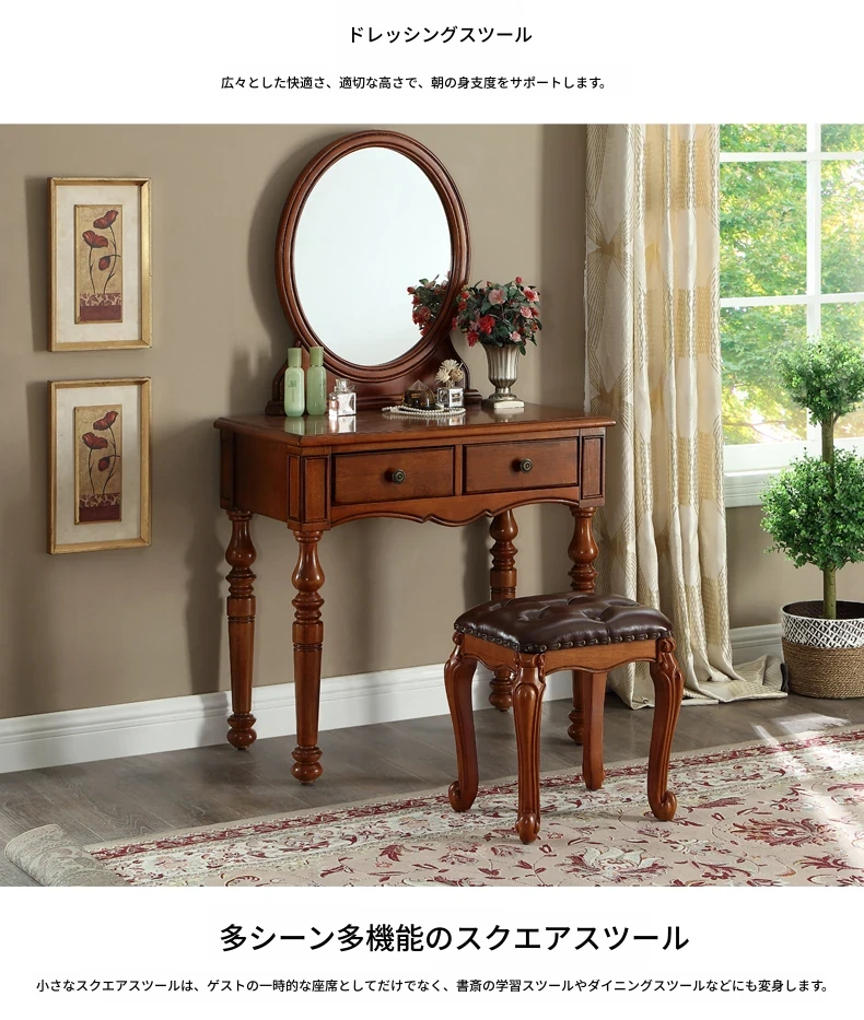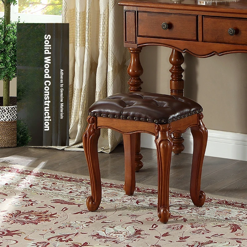 アメリカンスタイルのドレッシングスツール - 寝室にぴったりな無垢材製のヴィンテージドレッシングテーブル椅子!エレガントな欧風デザインで、メイクやネイルに最適なリラックス空間を演出します。