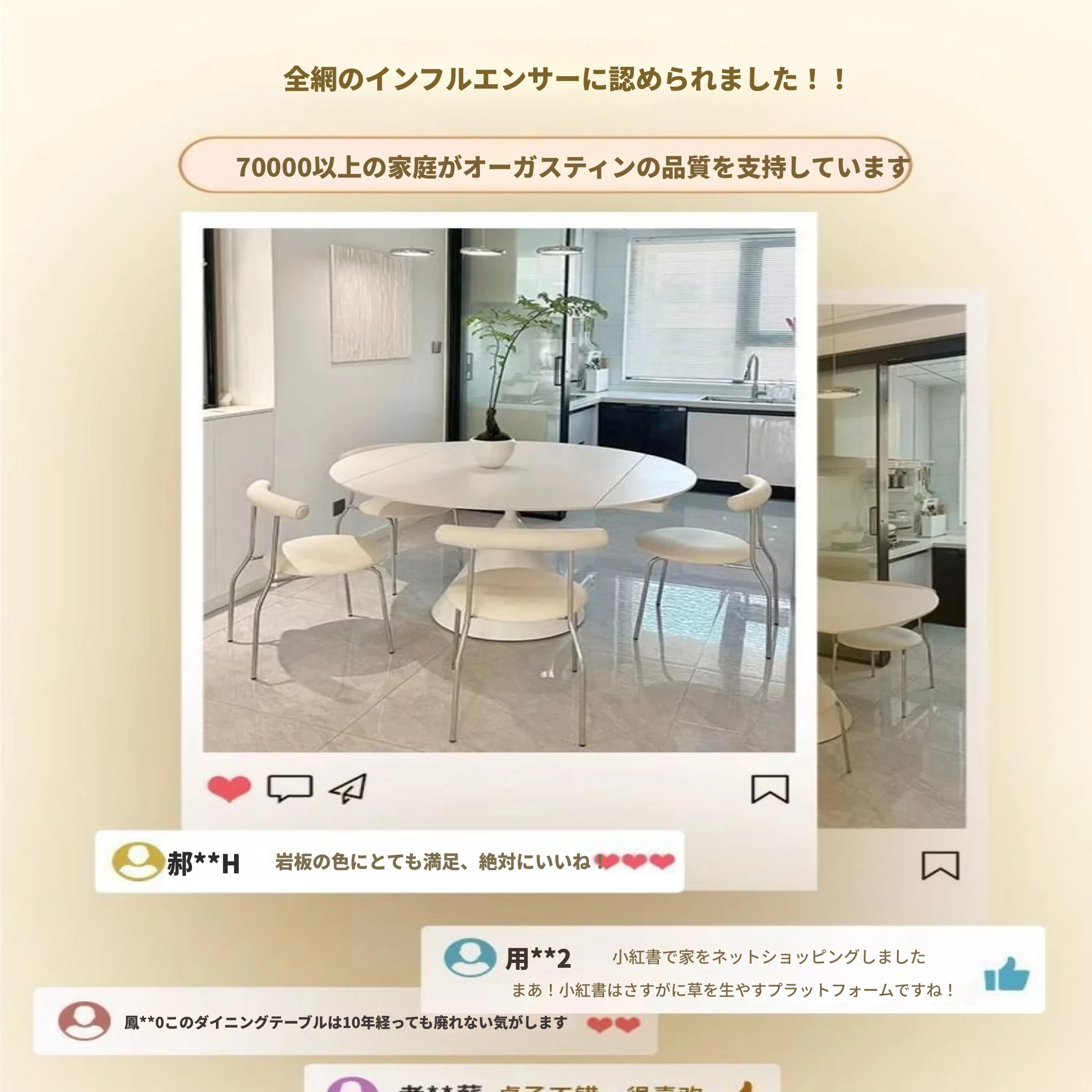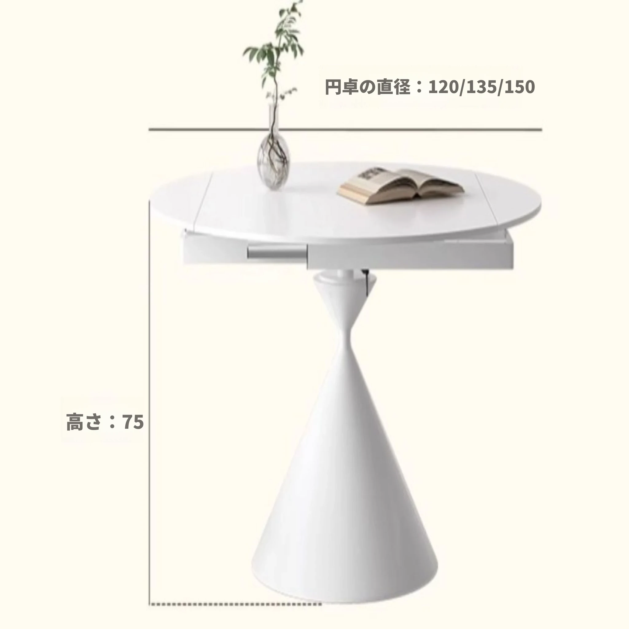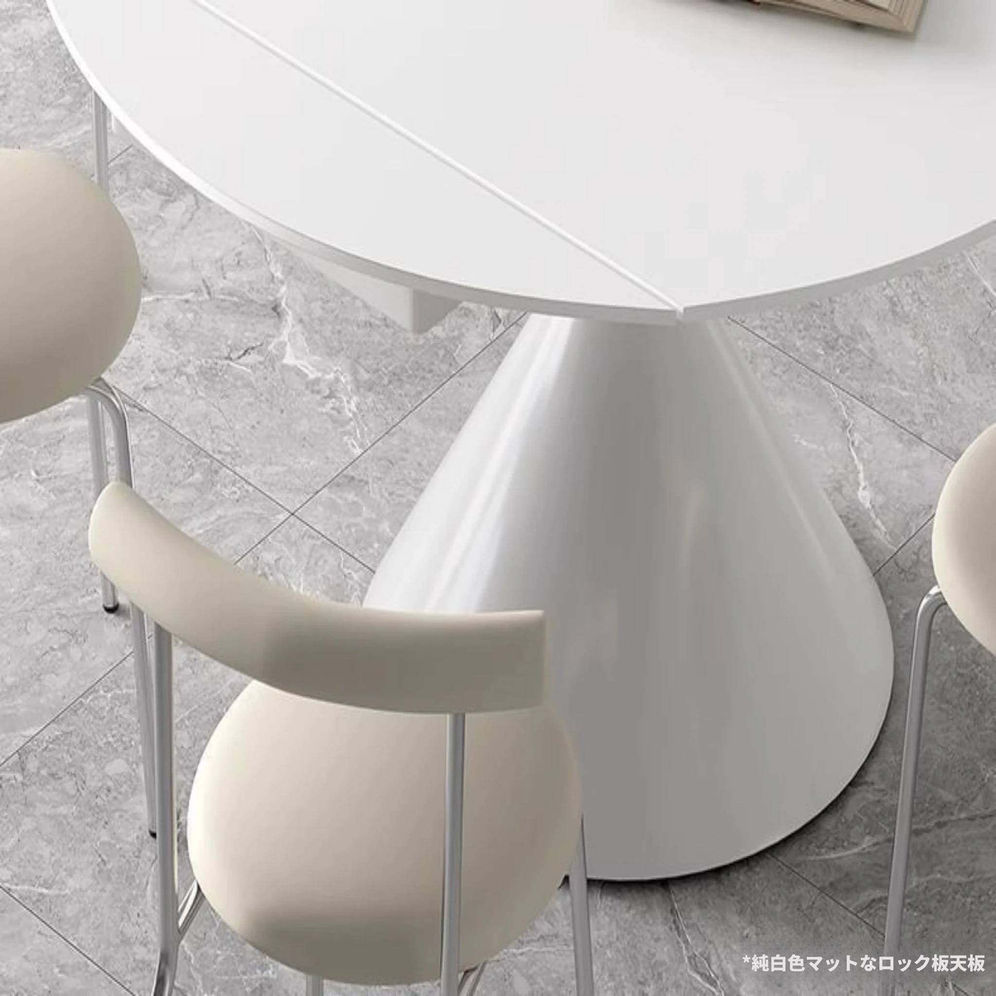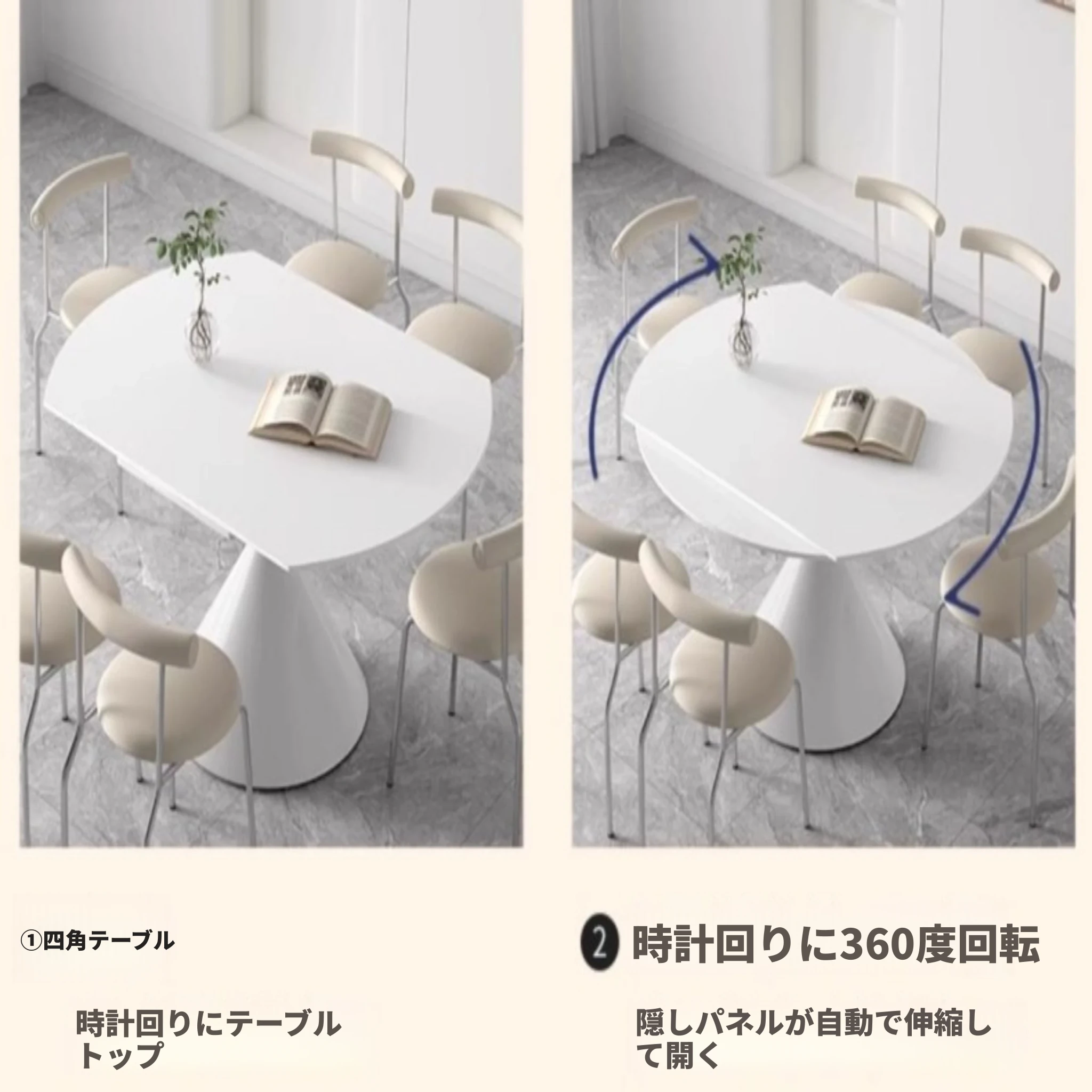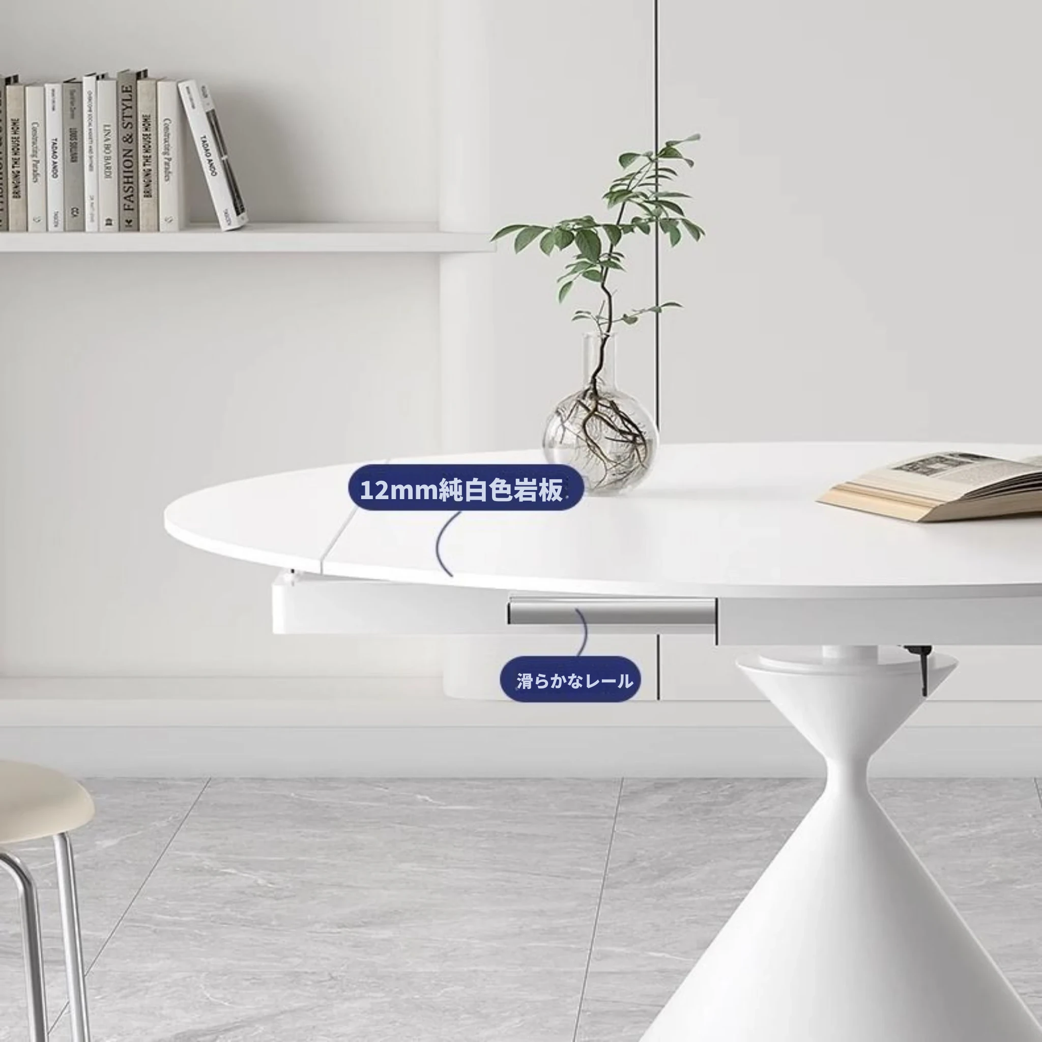 クリーム風味の純白マット仕上げのロックプレートテーブル!回転式・伸縮可能なワルツスタイル、四角から円形に変形できる便利な2WAYテーブル。どんなインテリアにもぴったり!