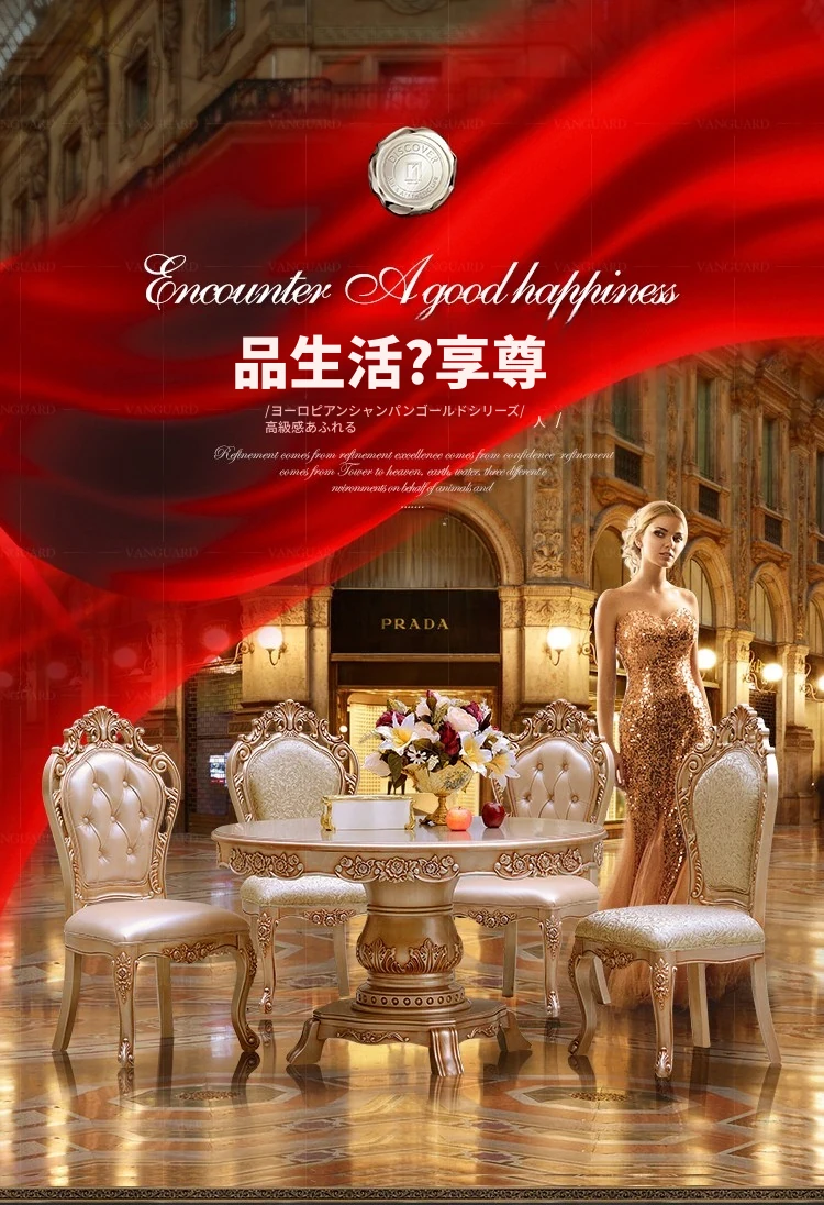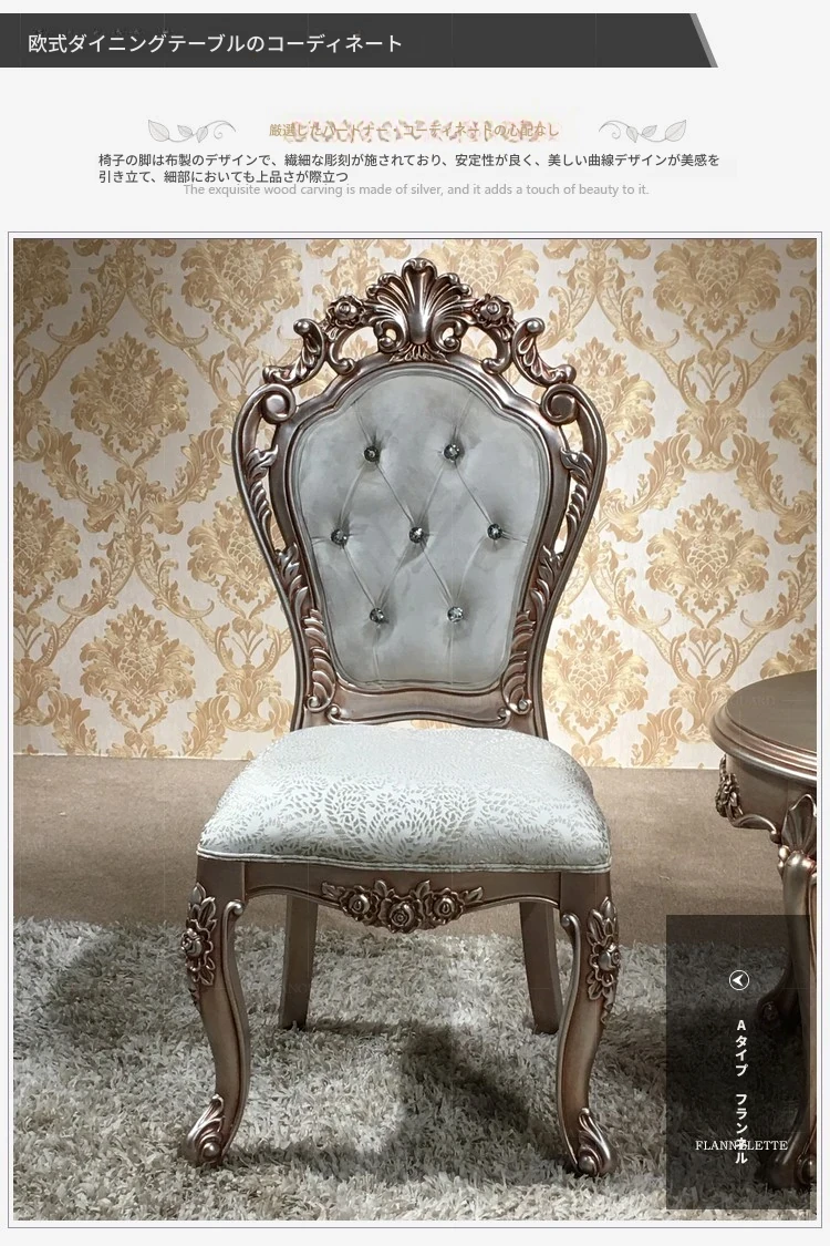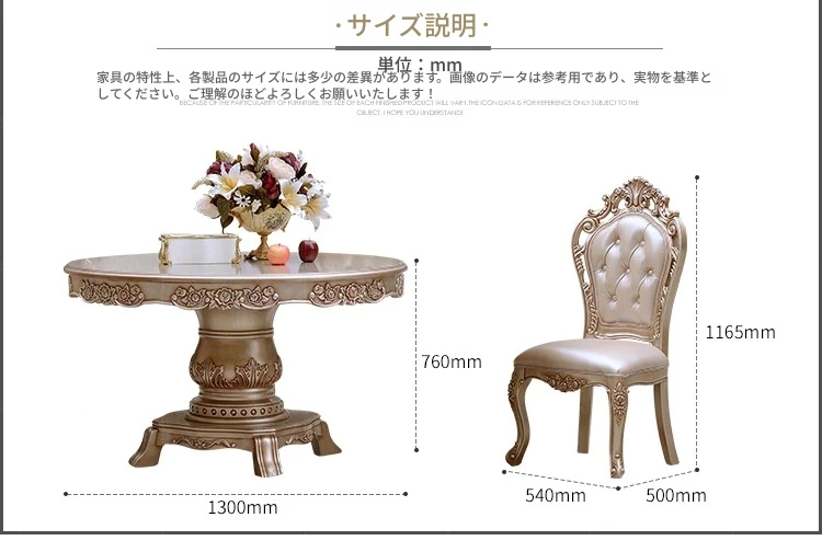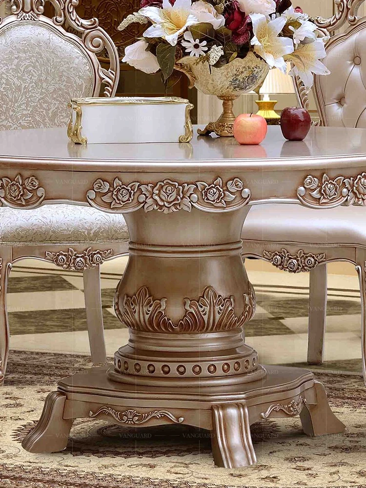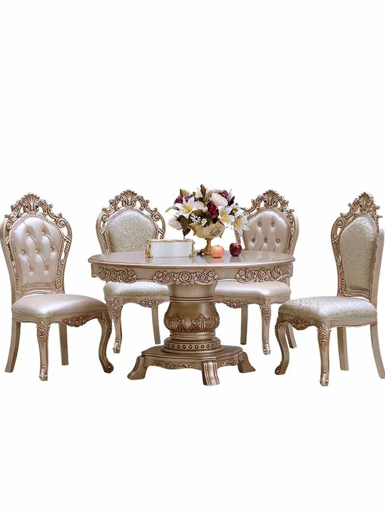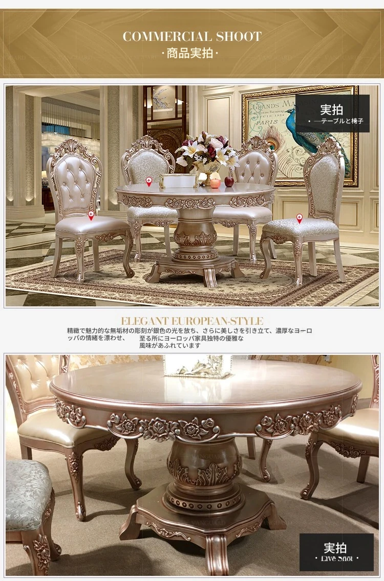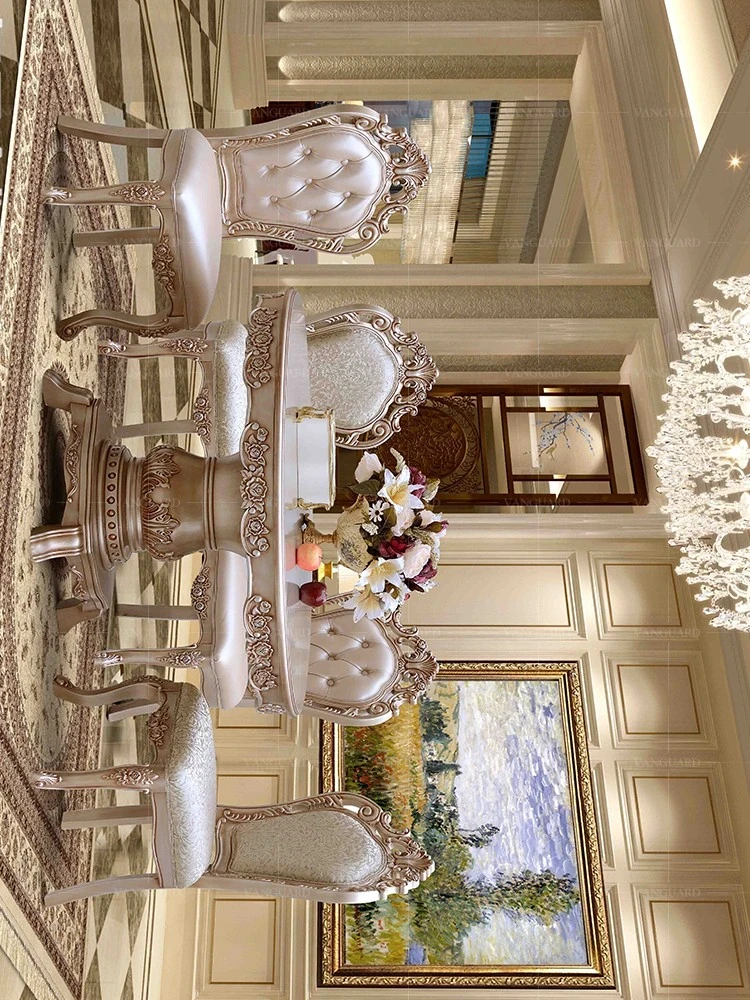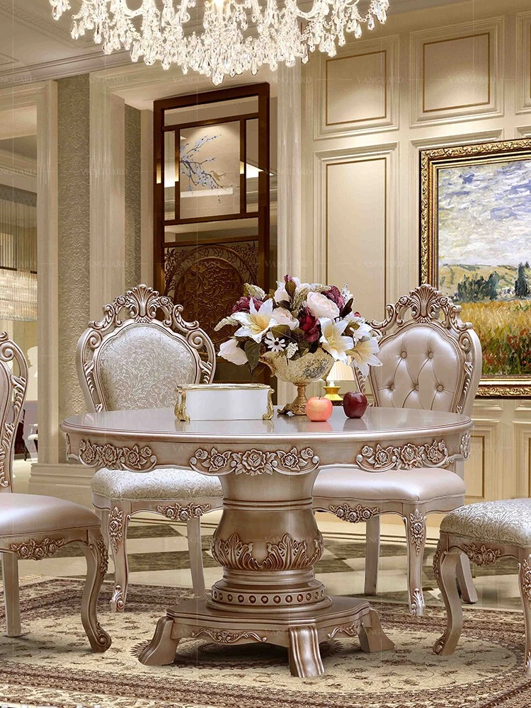 ヨーロピアンスタイルの無垢材ダイニングテーブルセット - 新古典主義のラグジュアリーな円形テーブルと6脚の椅子、小型住宅に最適な一品。家族団らんやおもてなしにぴったり!