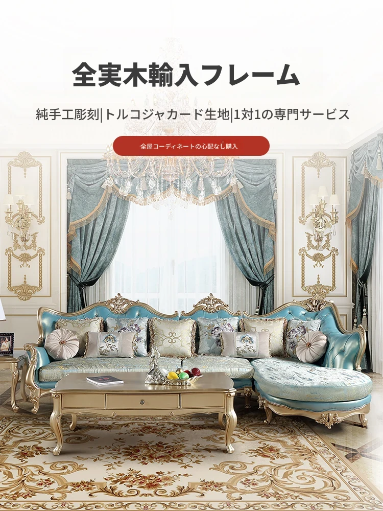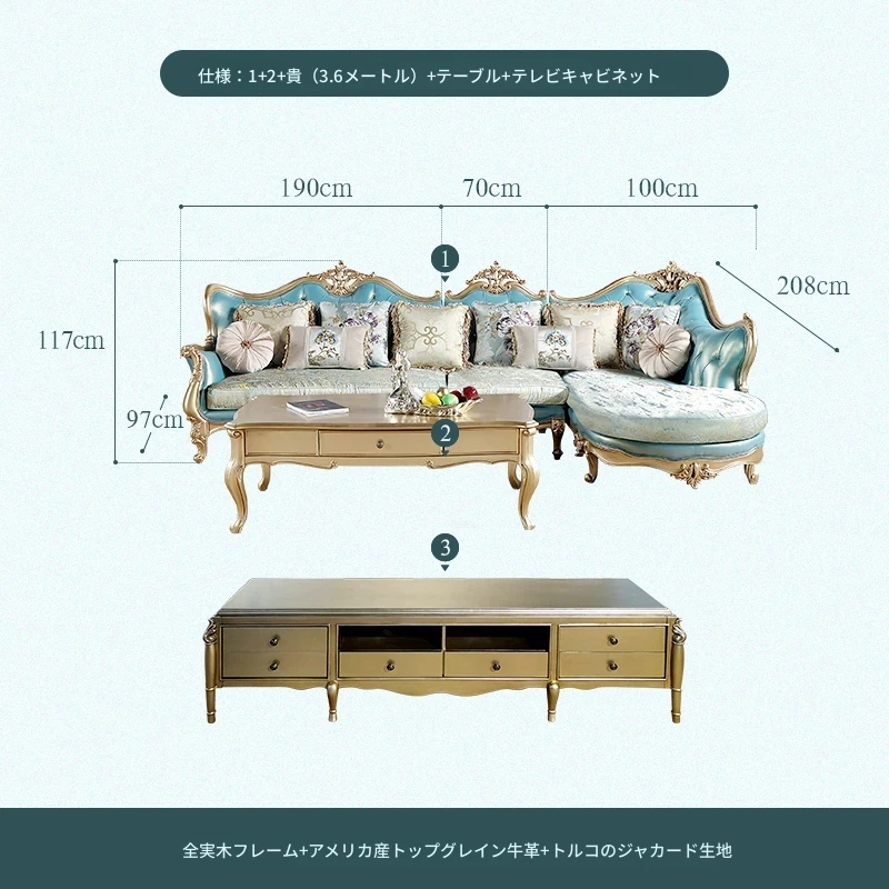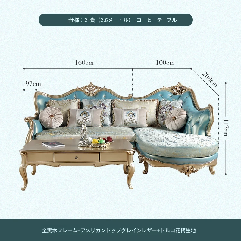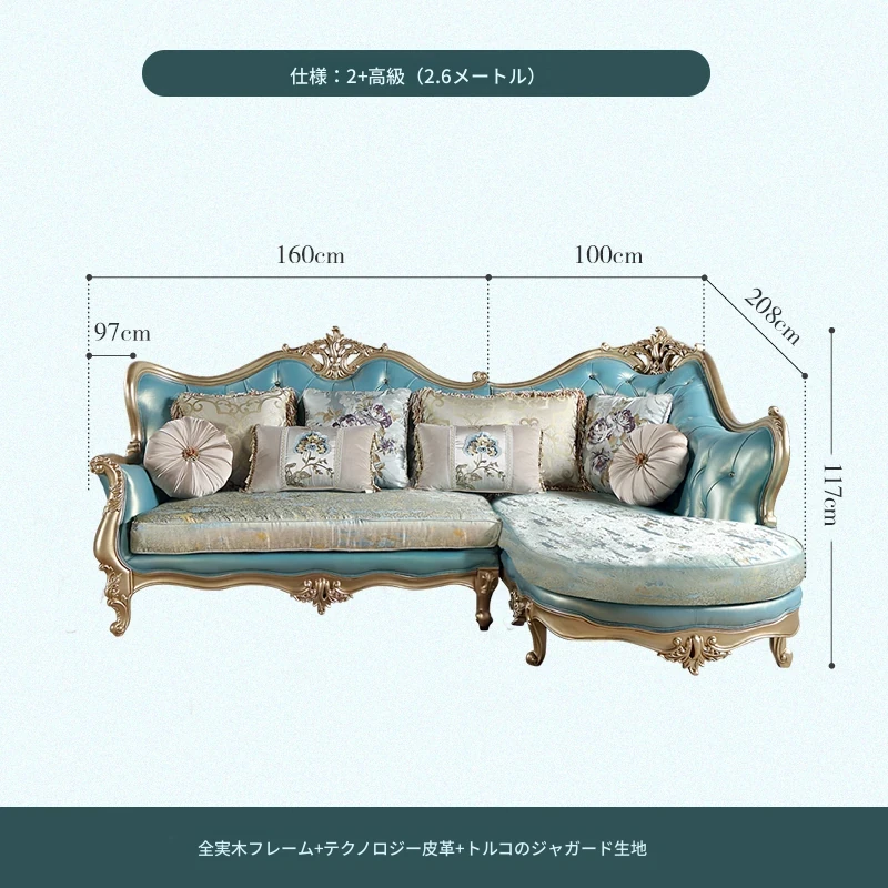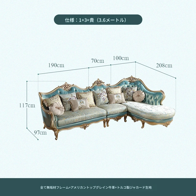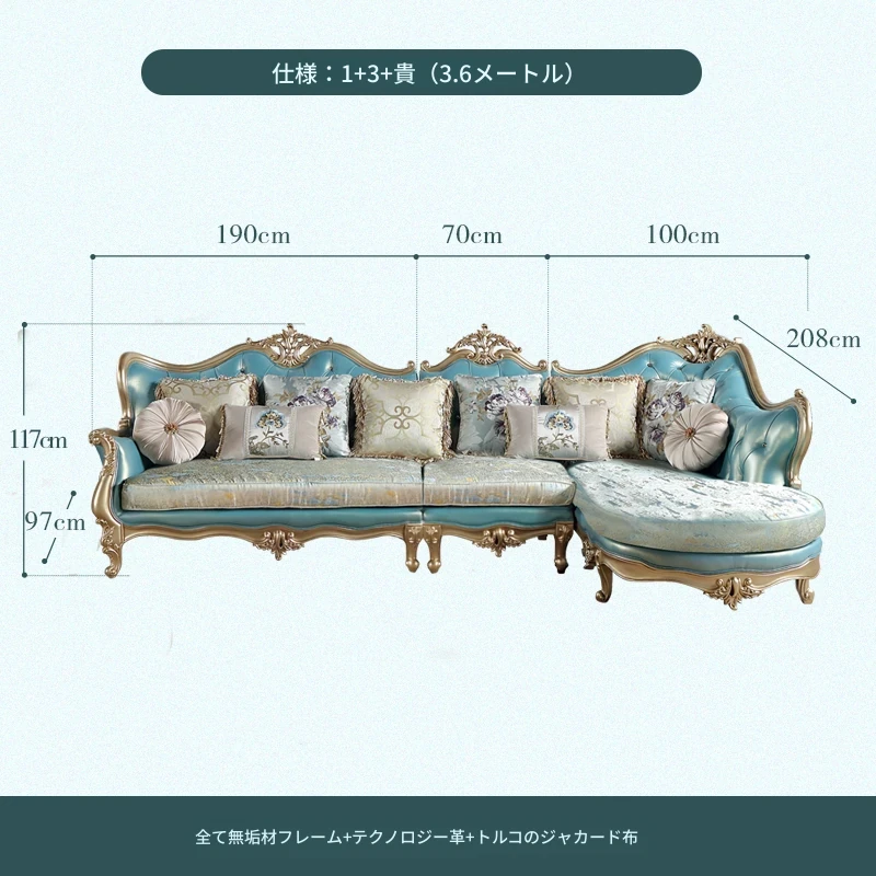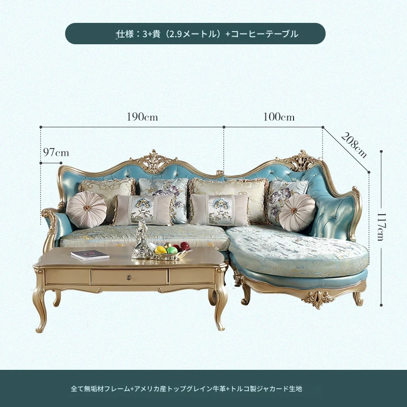 高級感あふれるブルーの本革コーナーソファ - 欧風スタイルのリビングにぴったり!高級な木製フレームとエレガントなフランス風デザイン、ラグジュアリーな軽い布地のクッション付きで、贅沢なくつろぎ空間を実現します。