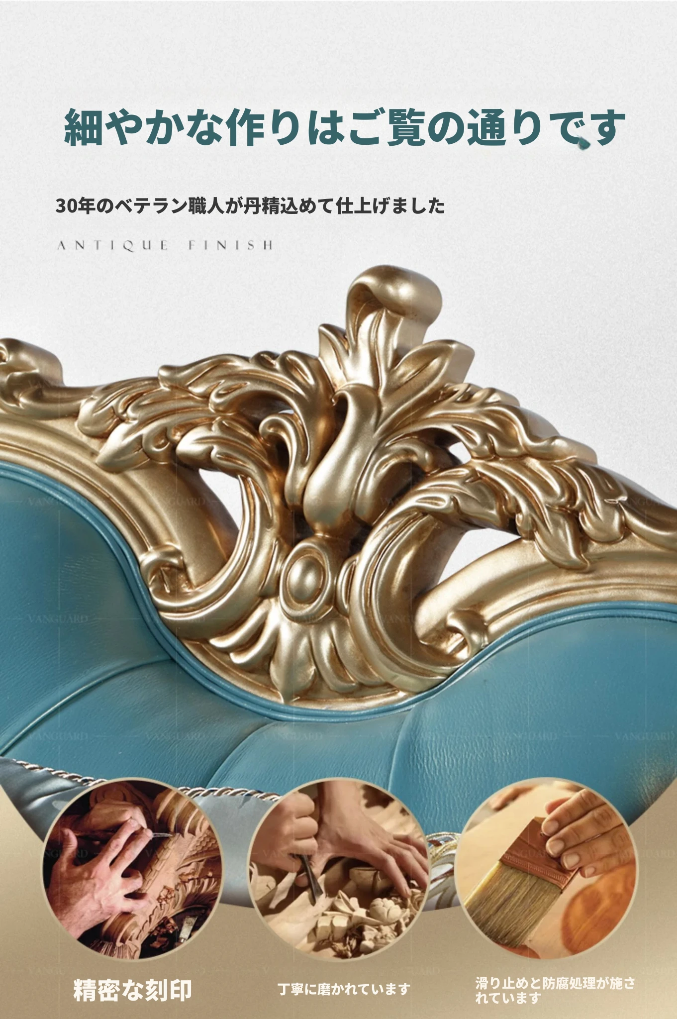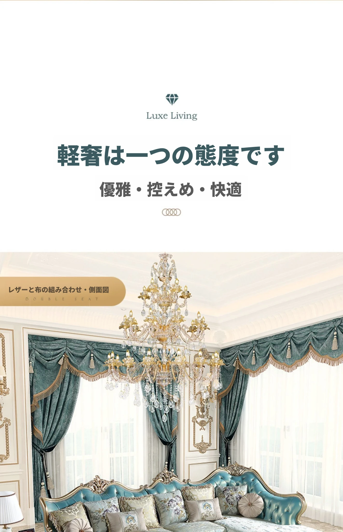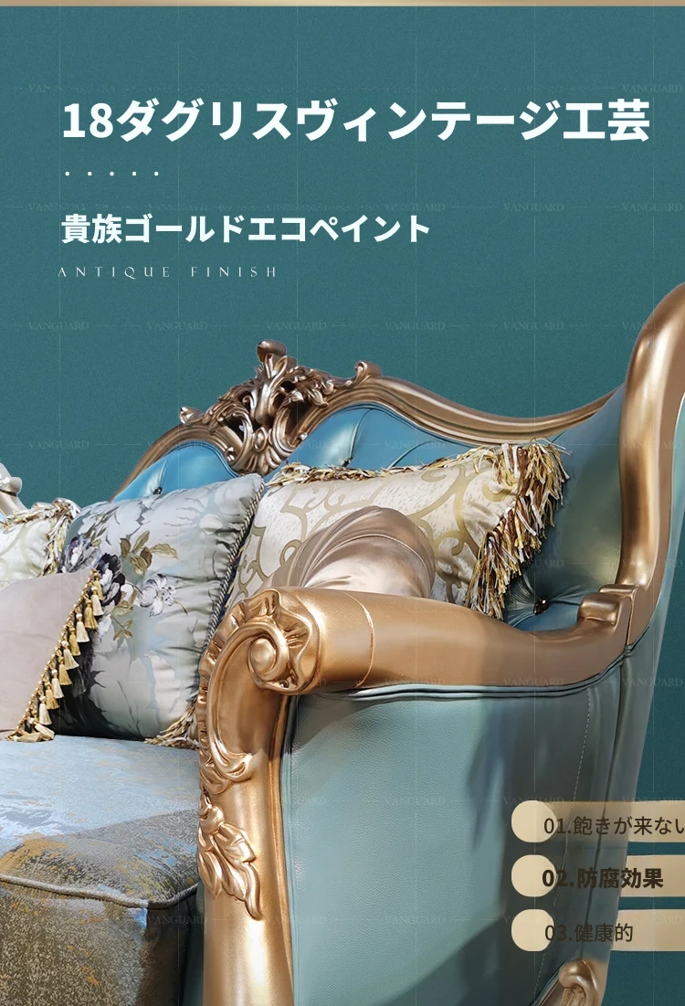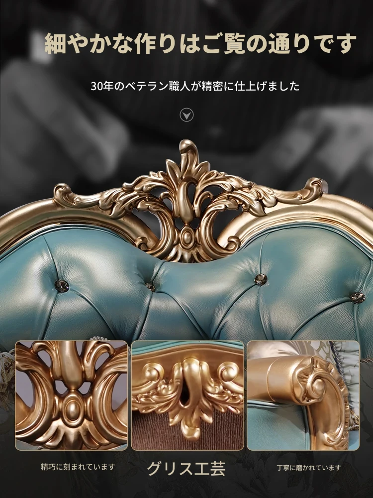 高級感あふれるブルーの本革コーナーソファ - 欧風スタイルのリビングにぴったり!高級な木製フレームとエレガントなフランス風デザイン、ラグジュアリーな軽い布地のクッション付きで、贅沢なくつろぎ空間を実現します。