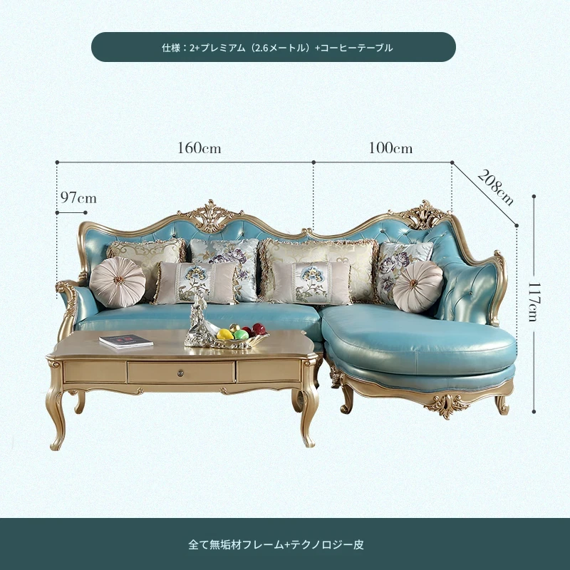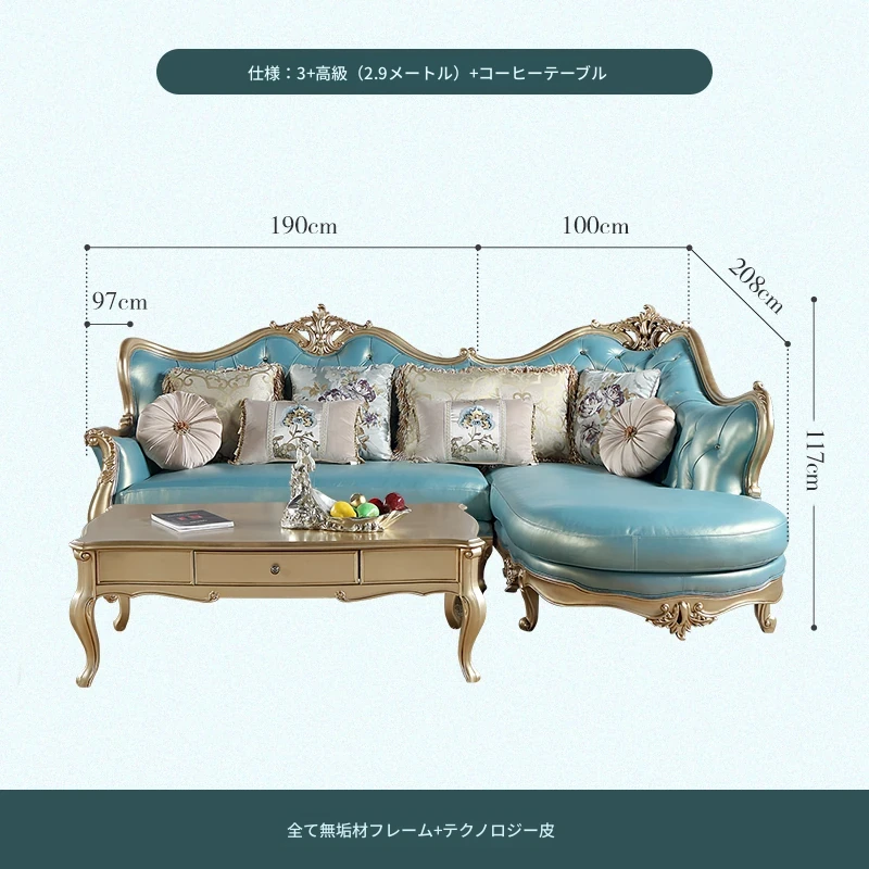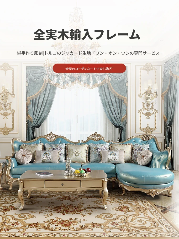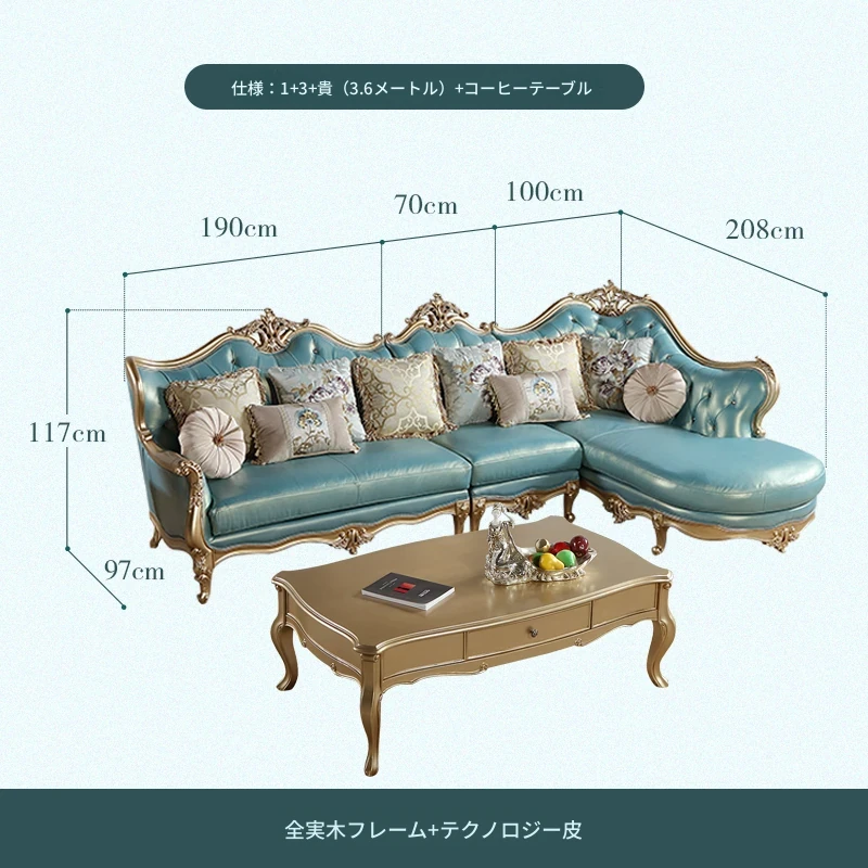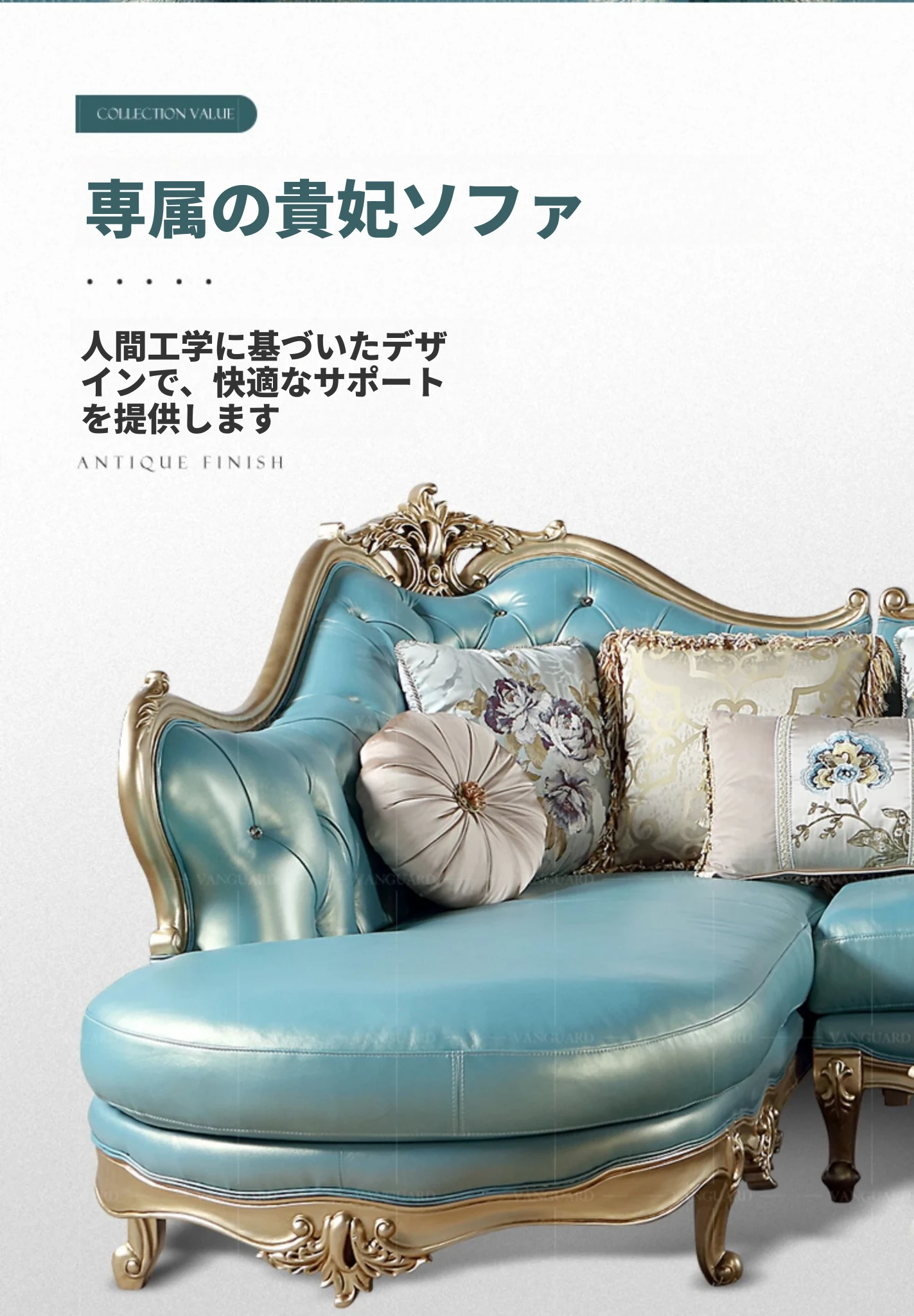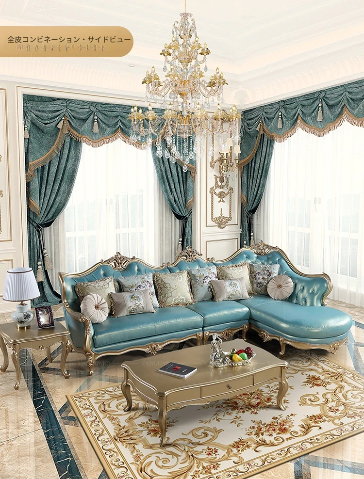 高級感漂う欧風L字型コーナーソファー 本革使用の青色フレンチスタイル、リッチな雰囲気の軽奢組み合わせ、優雅な日常を演出!