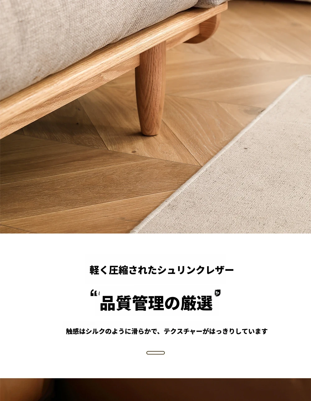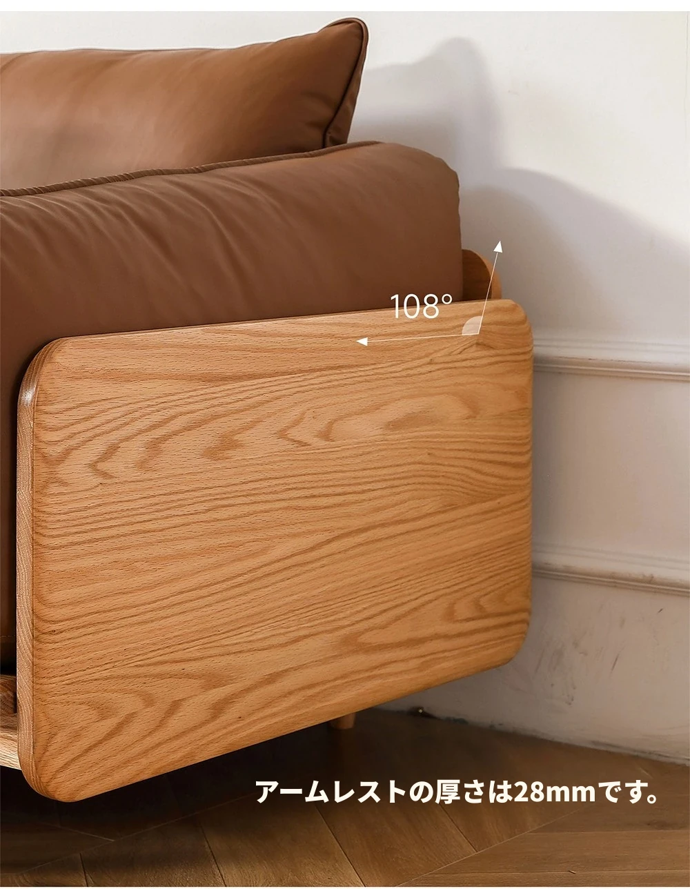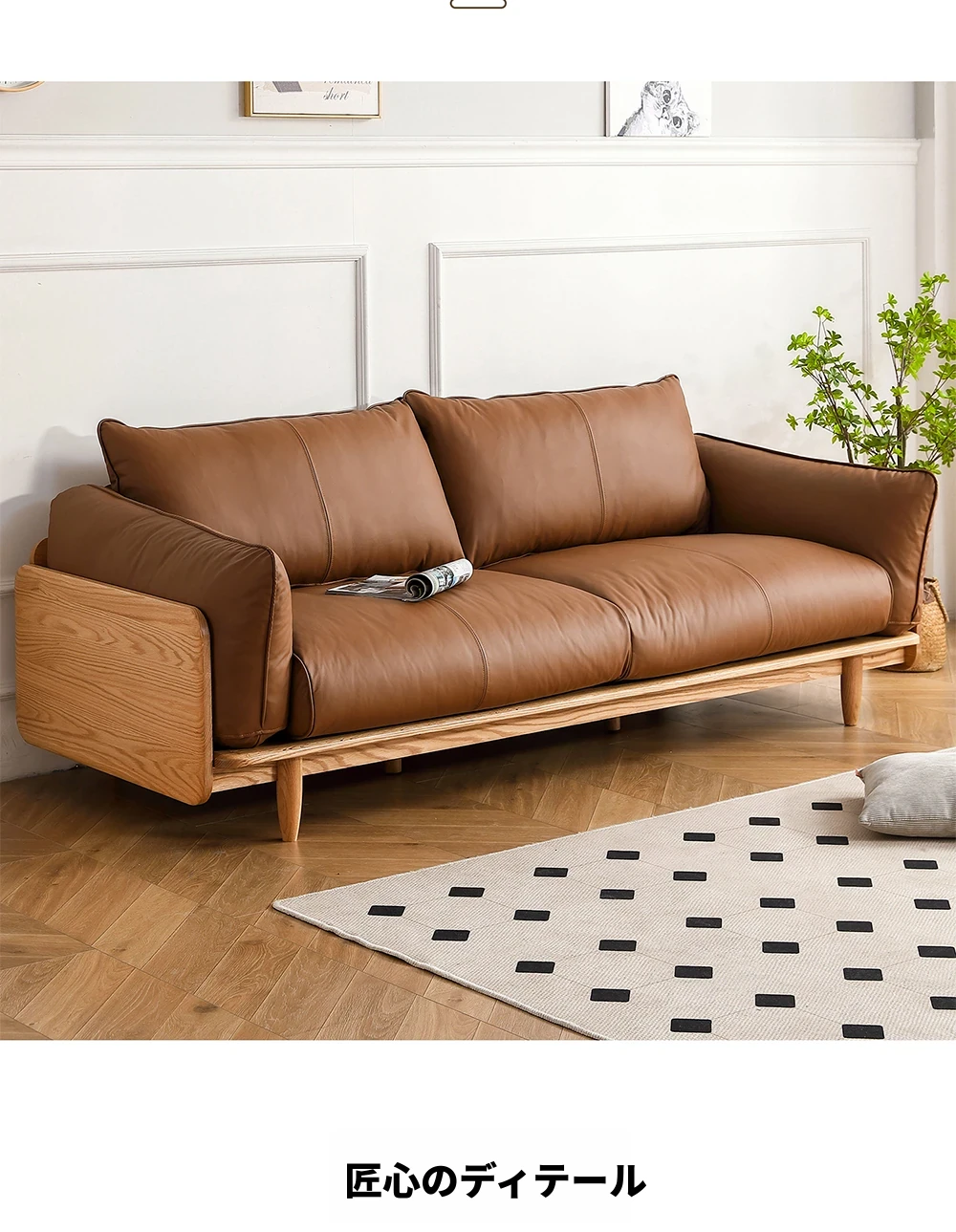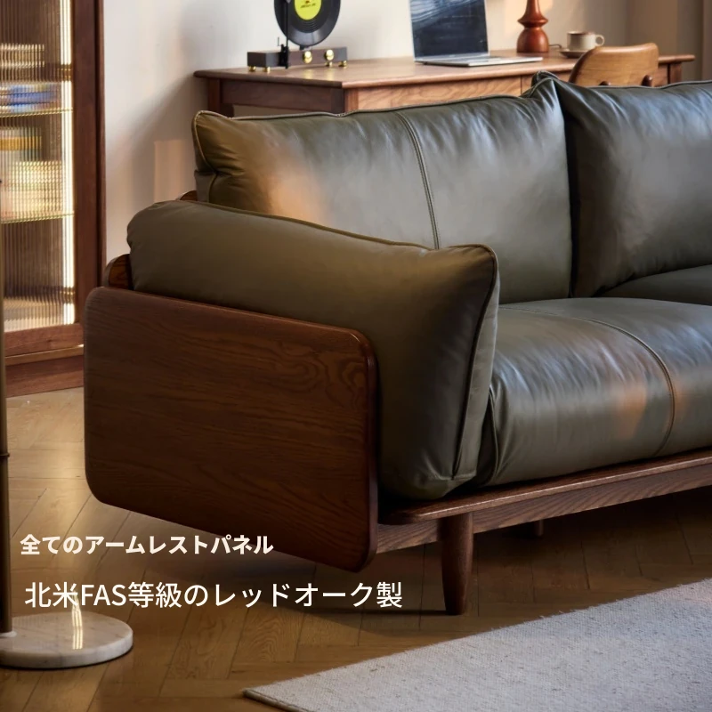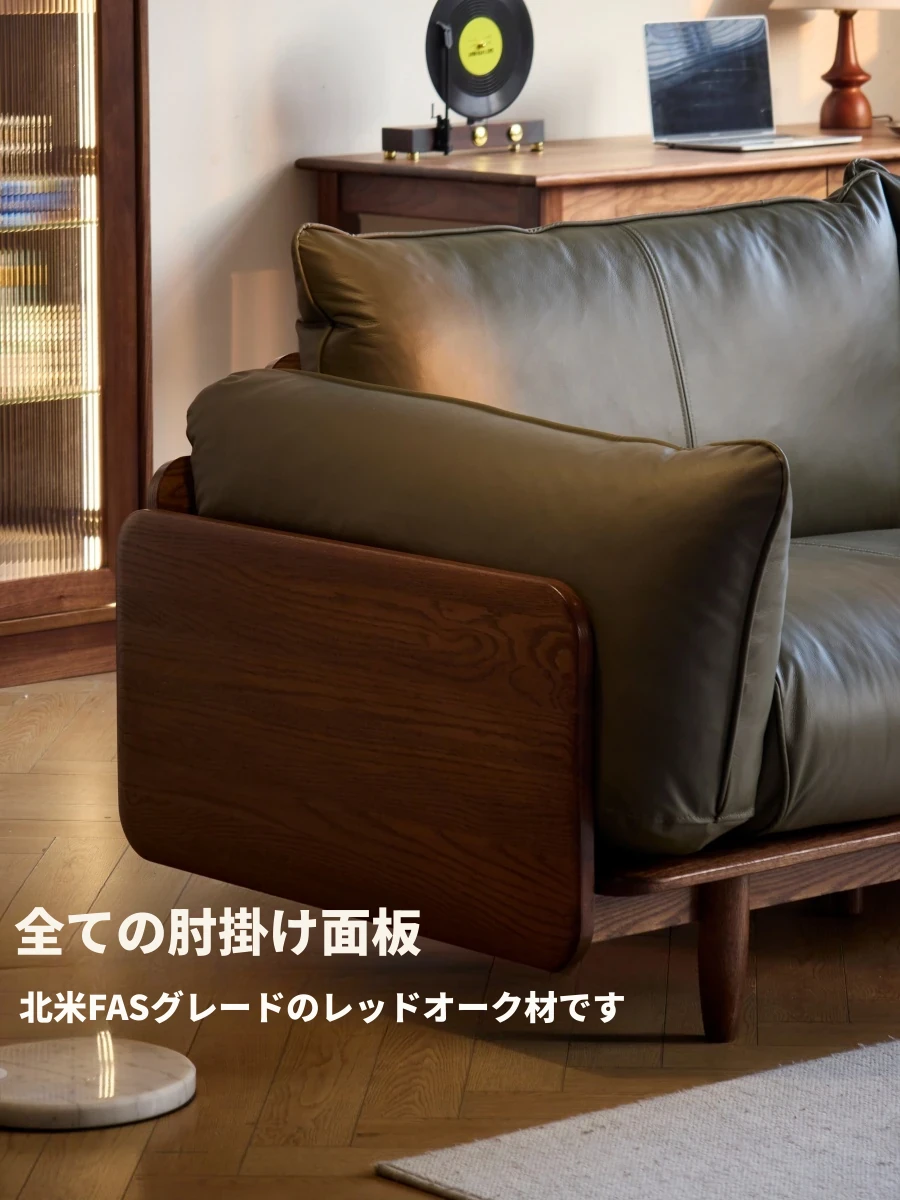 全実木製のレッドオーク真皮ソファー - 北欧スタイルのリビングに最適!高背もたれで快適さアップ、ナチュラルな木の温もりを感じるオリジナルデザインの布張りソファー。家庭用にぴったり!