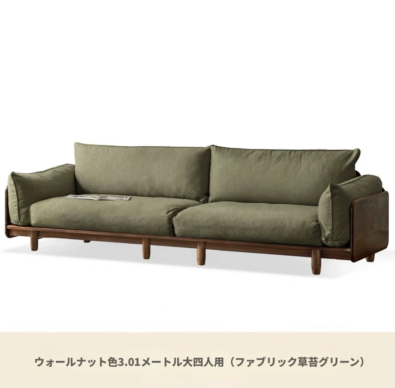 高くなったアップグレード版 オーク(ウォールナット色)3.01メートル大4人掛けソファ(布地 モスグリーン)