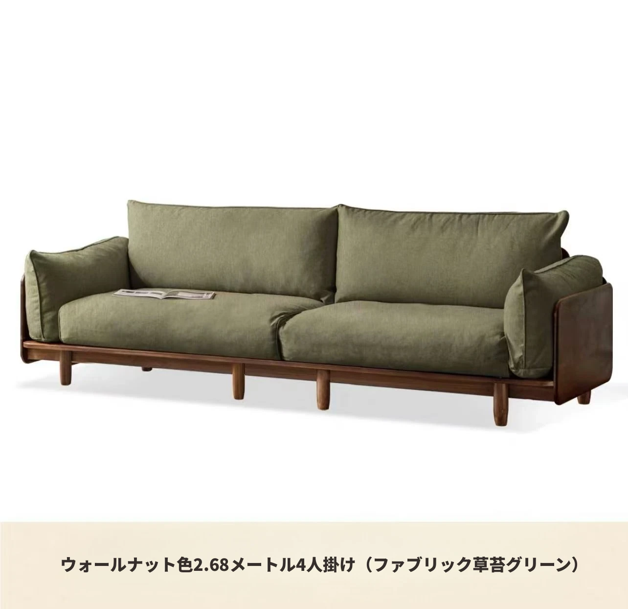 高くなったアップグレード版 オーク(ウォールナット色)2.68メートル4人掛けソファ(布地 モスグリーン)