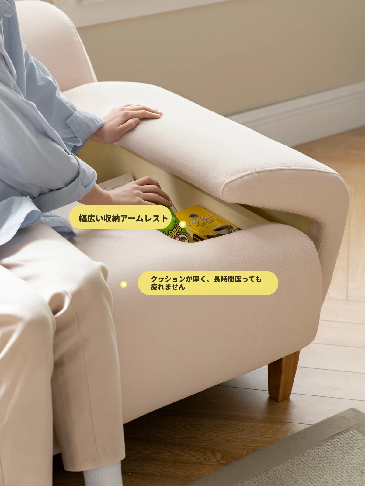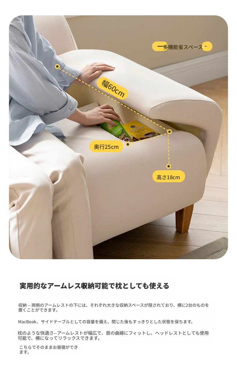 【完全に解体洗浄可能、肘掛けに収納機能付き】