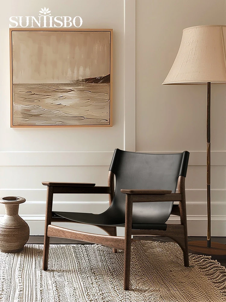 Solid Wood Single Sofa Chair - North American Black Walnut for Living Room, Balcony, and Relaxation. Features Genuine Leather Upholstery and Comfortable Backrest, Perfect for Bedroom or Lounge Areas.