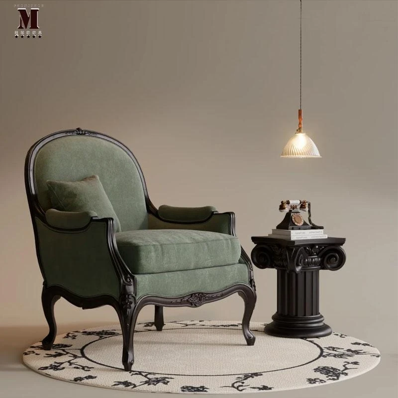 フレンチヴィンテージの無垢材シングルソファチェア【ブラック】小型リビング向け、リラックスできるタイガーチェア!寝室やバルコニーにも最適!おしゃれで機能的な空間を演出します。